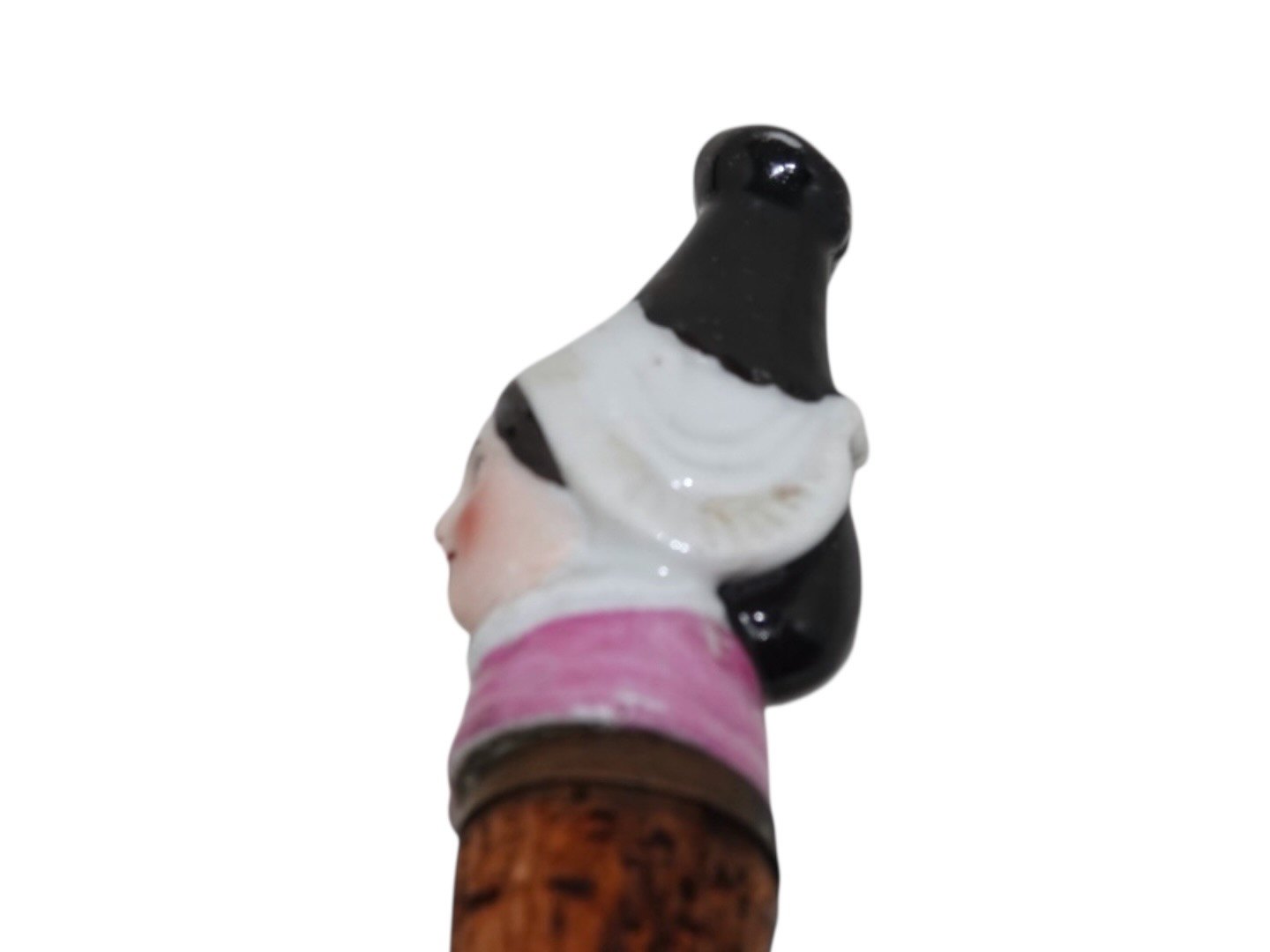 Bottle stopper shaped as a woman from around 1890-1900.Length 8.5 cm. including the cork.