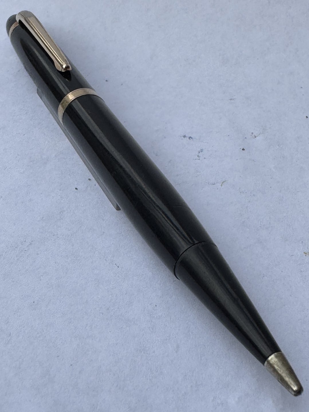 Sort Montblanc no. 15 skrueblyant. I god stand. Klar til at blive brugt. Bly-stifter skal tilkøbes før end den igen kan skrive.