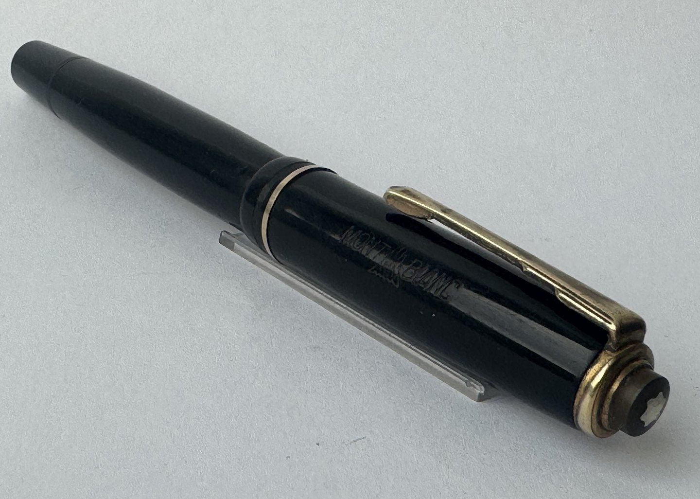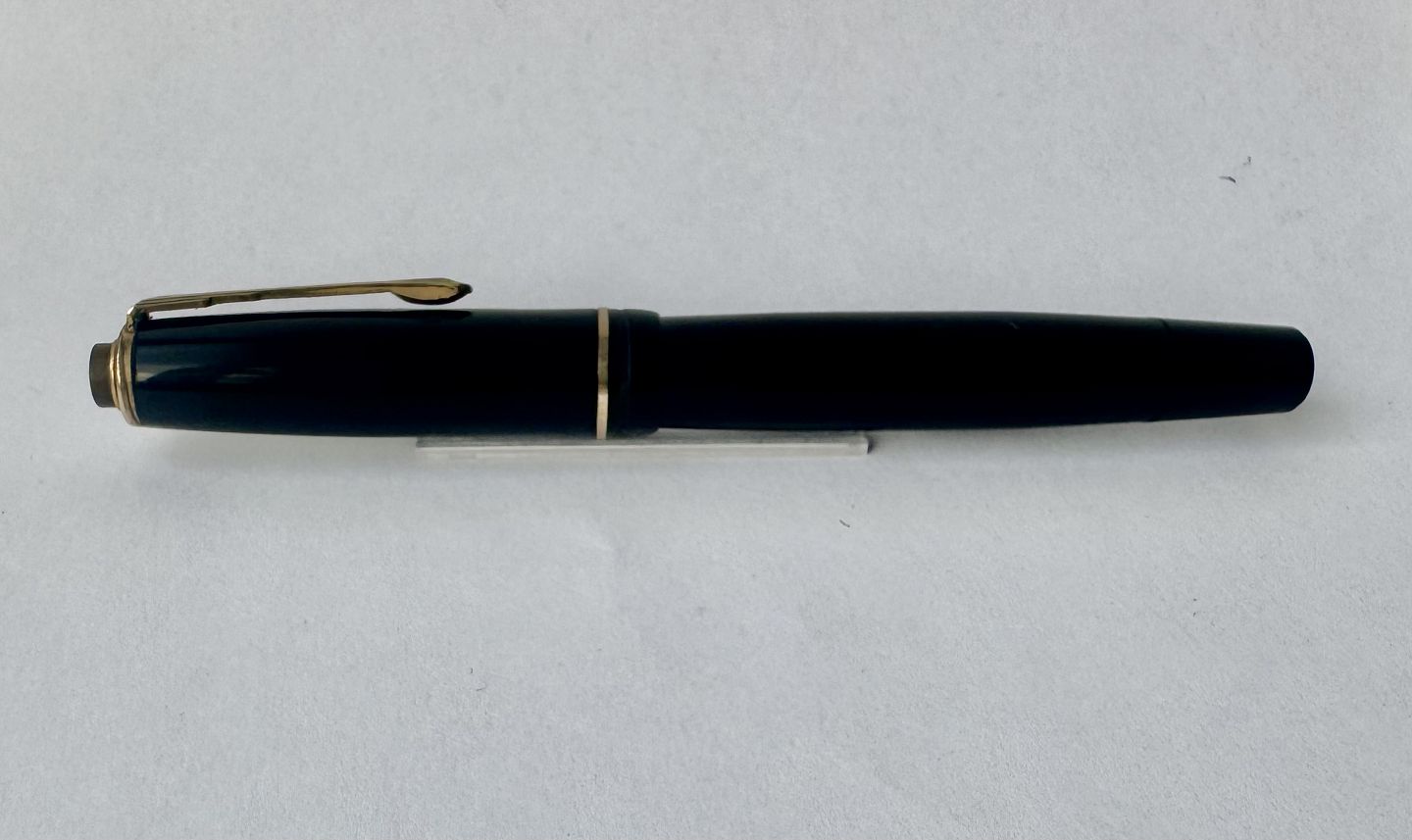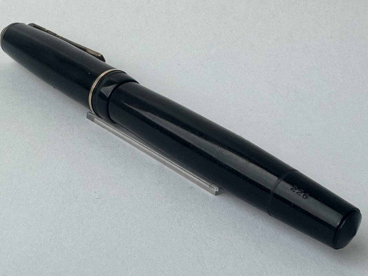 Sort Montblanc no. 226 fyldepen. Fremstillet i Danmark fra slutningen af 1940’erne. Mangler et mavebælte på hætten. Ellers i god stand uden skader eller reparationer. Hætten mærket med MONTBLANC den lille sorte bundskrue med modelnummeret 226. Der skal indsættes en ny gummisæk, før end den igen kan optage blæk og skrive påny.Ny gummisæk kan indsættes for en tilføjelse af kr. 200,- til betalingen af denne fyldepen.