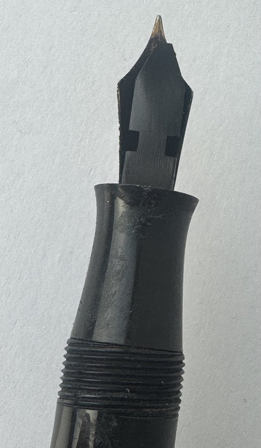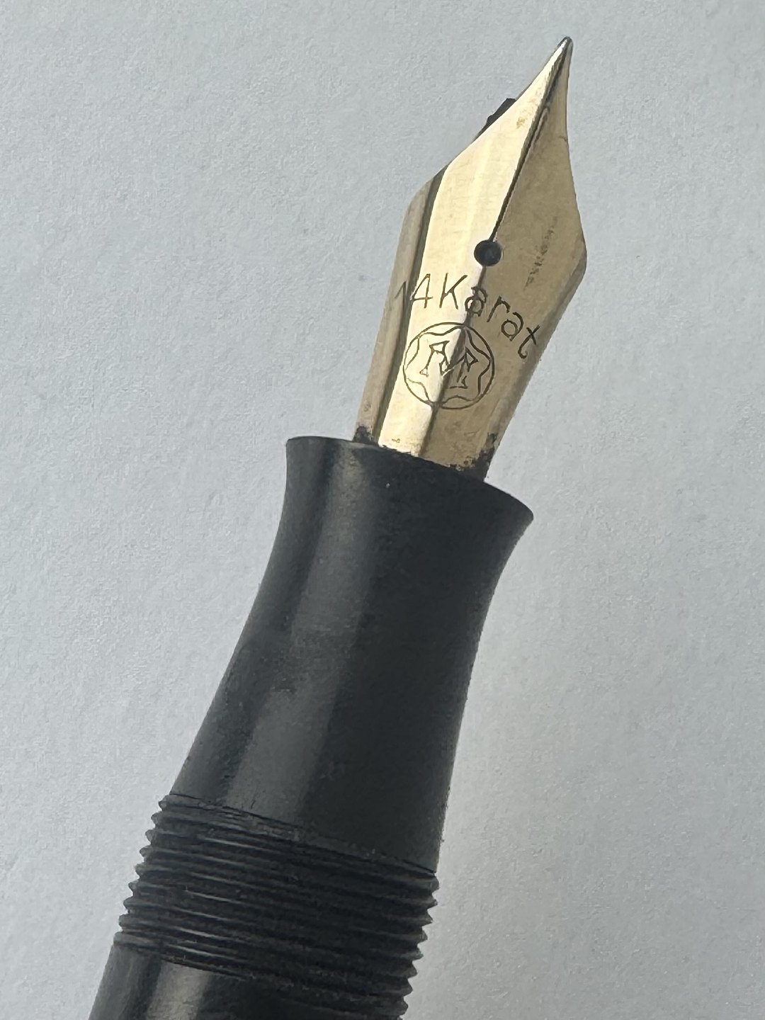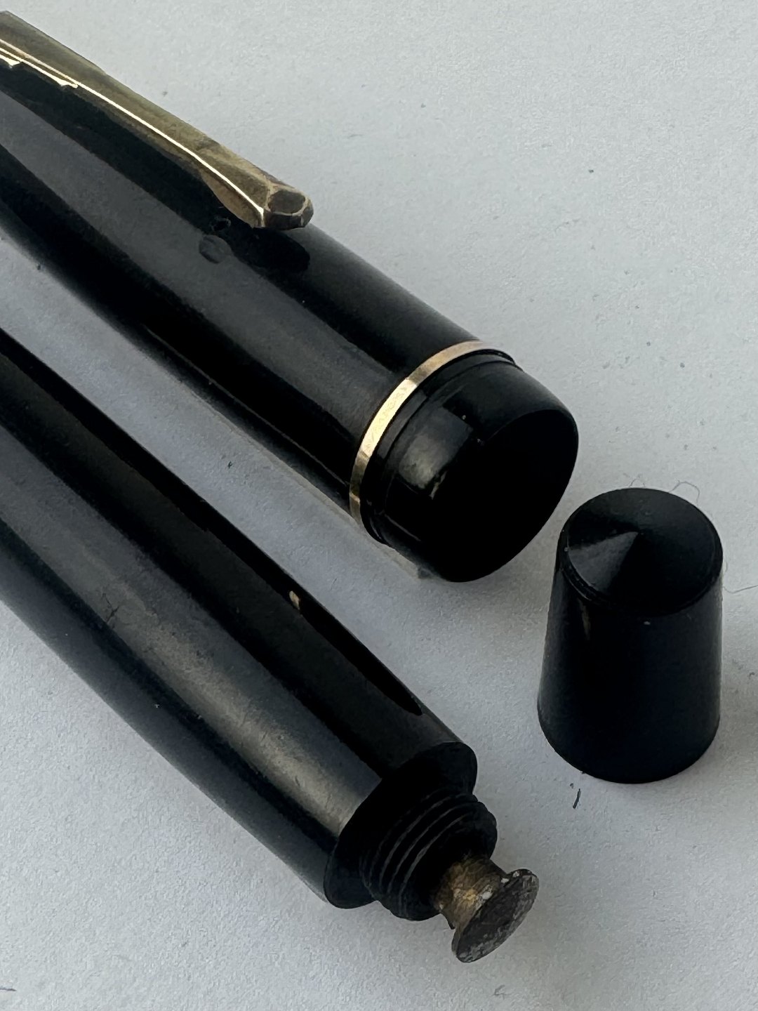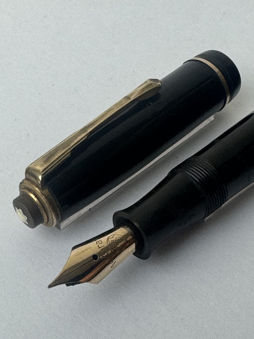 Sort Montblanc no. 226 fyldepen. Fremstillet i Danmark fra slutningen af 1940’erne. Mangler et mavebælte på hætten. Ellers i god stand uden skader eller reparationer. Hætten mærket med MONTBLANC den lille sorte bundskrue med modelnummeret 226. Der skal indsættes en ny gummisæk, før end den igen kan optage blæk og skrive påny.Ny gummisæk kan indsættes for en tilføjelse af kr. 200,- til betalingen af denne fyldepen.