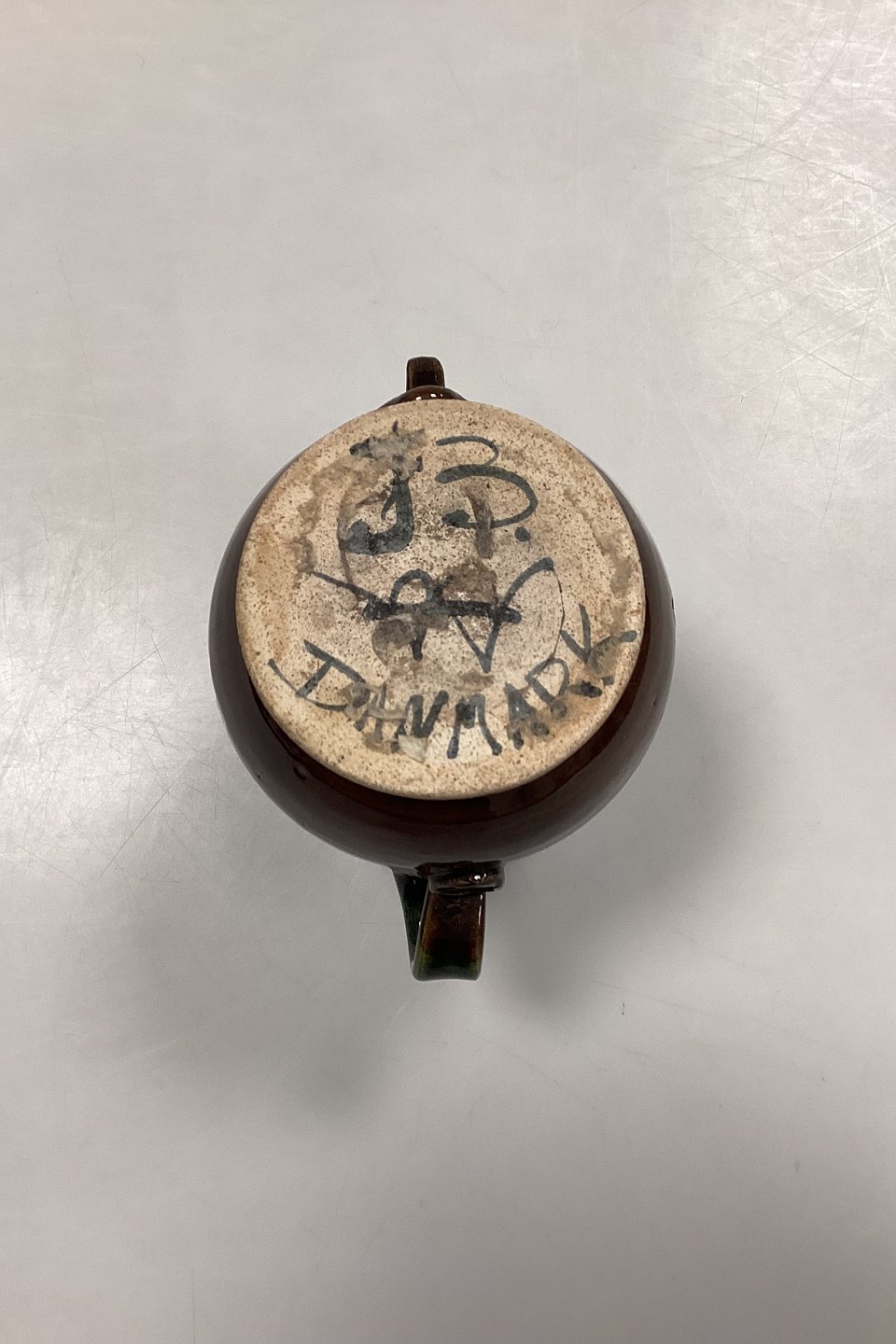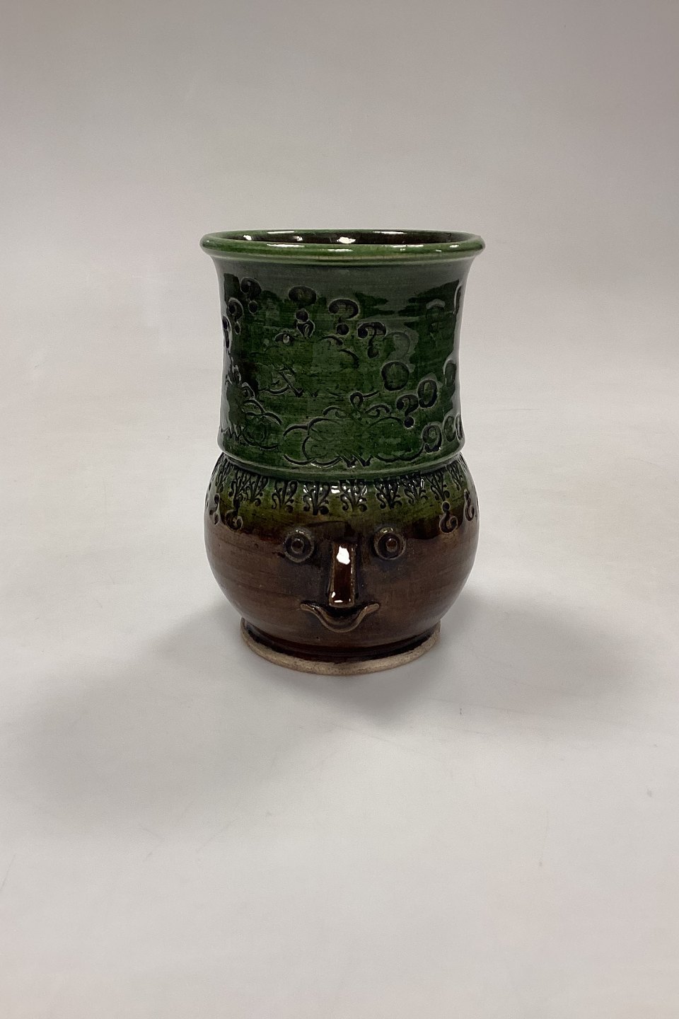 Bjørn Wiinblad Vase in glazed Stoneware. Motif with face, handle and embossed stencil patterns in brown and green glaze.Measures 14 cm / 5.51 in.
