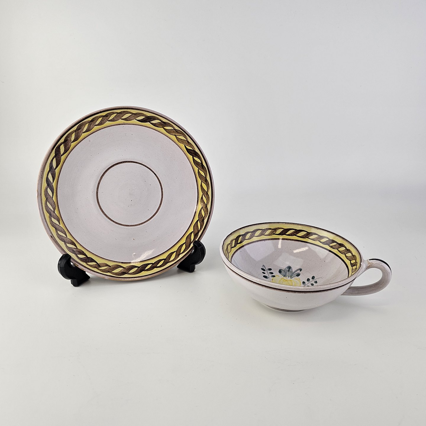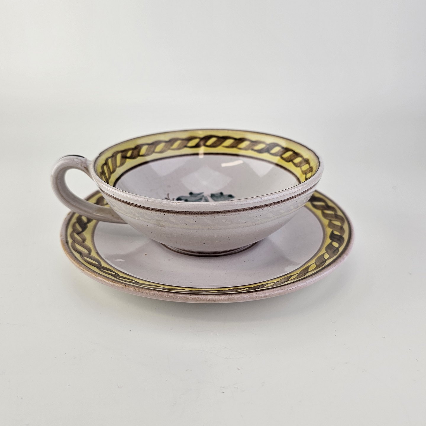 Kop og underkop i keramik med gule detaljer og blomsterdekorationProducent Lars Syberg keramik