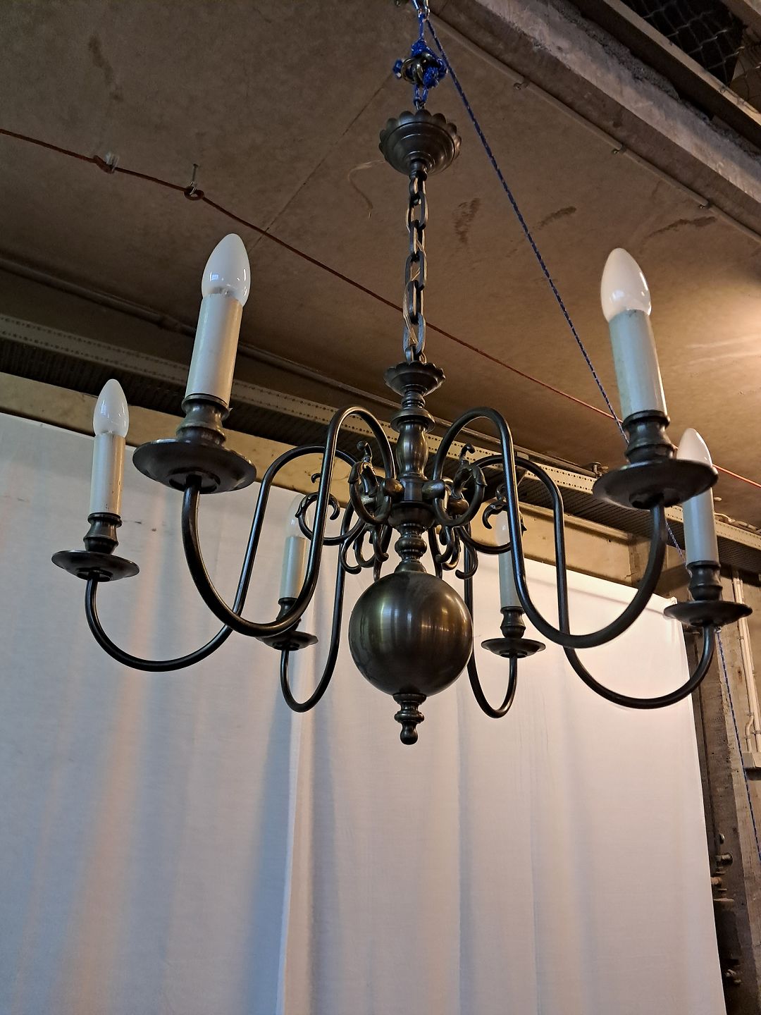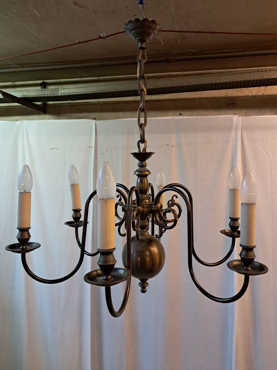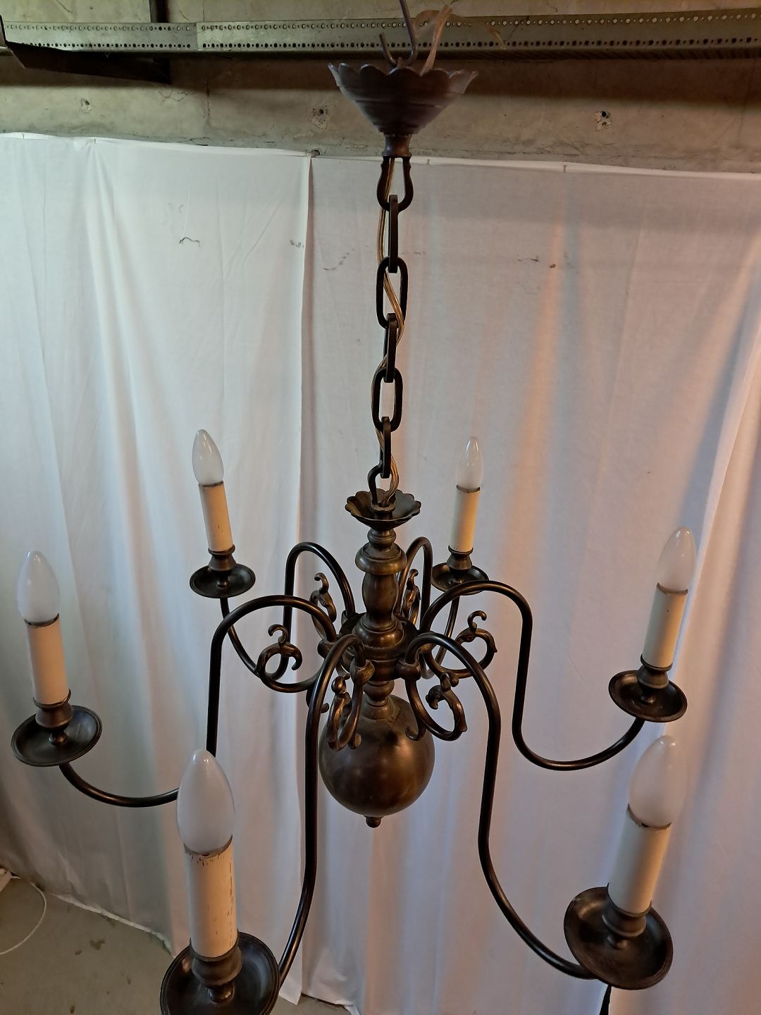 6-armet kirkekrone i bruneret messing, fra 1930erne.Den har brugsspor.