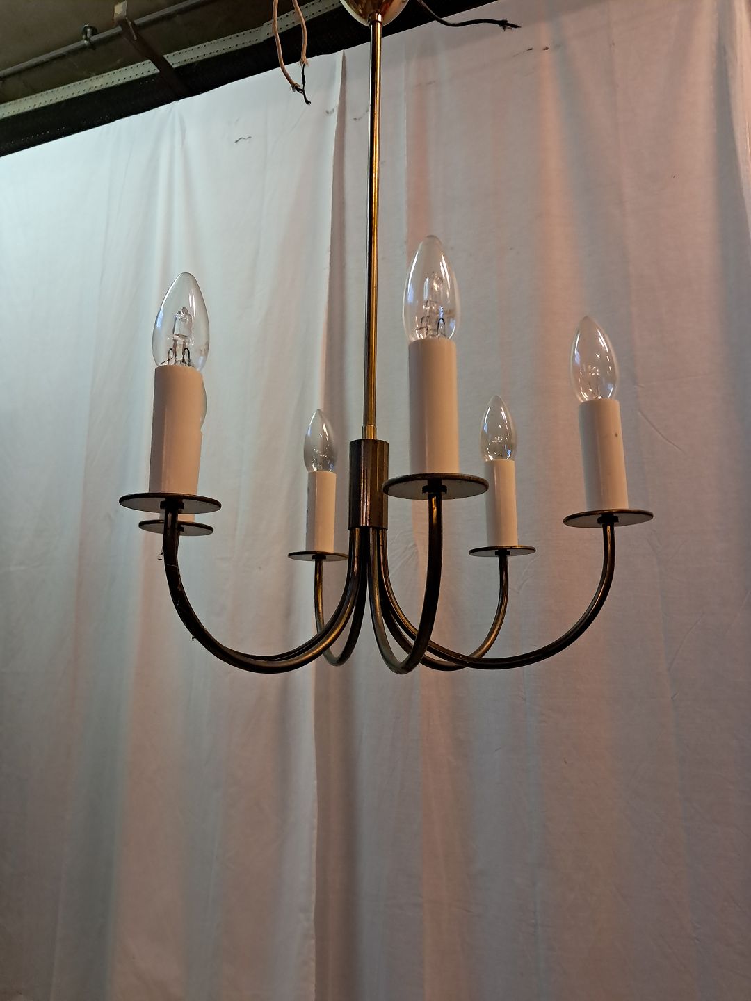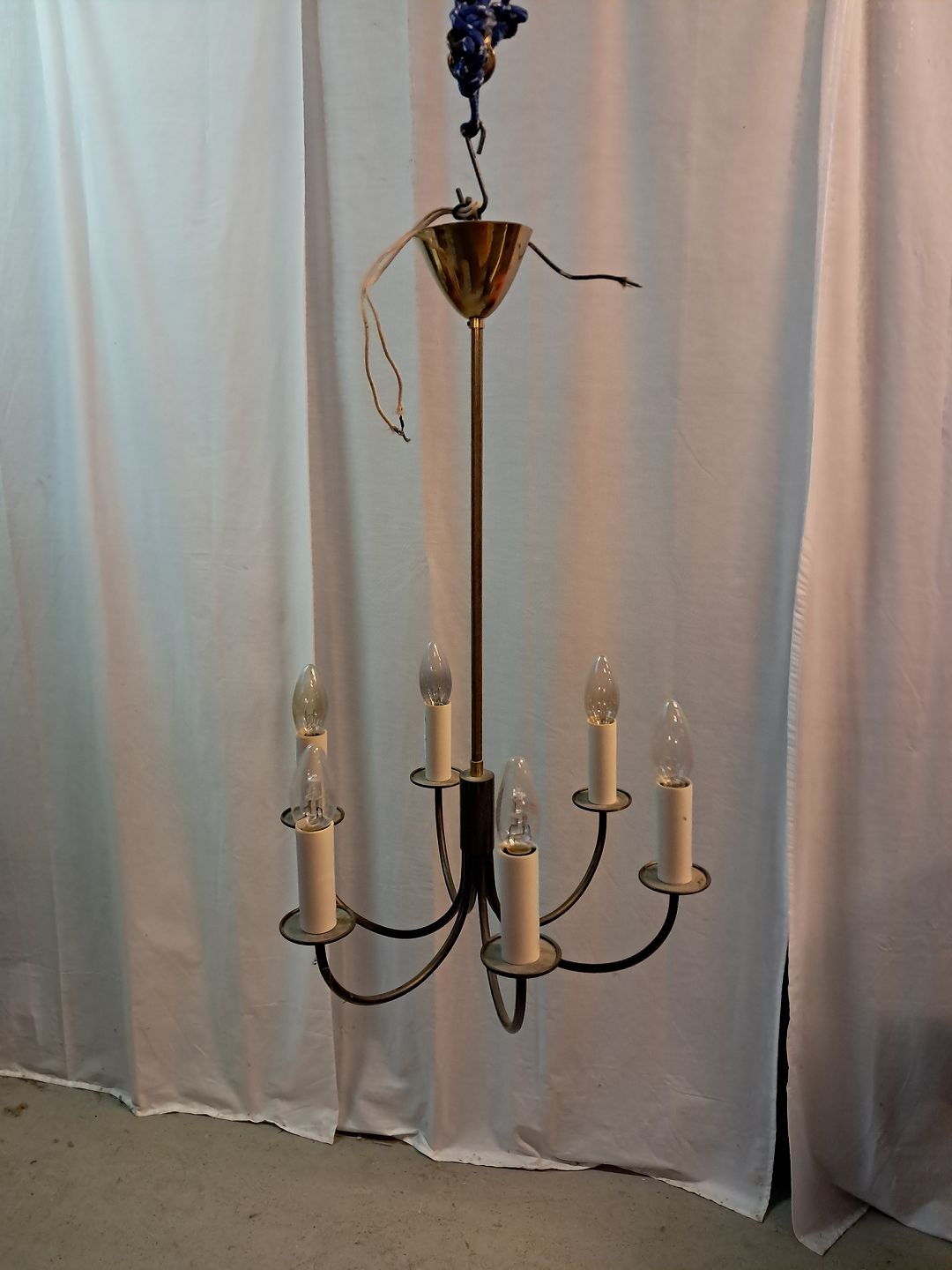 6-armet lysekrone i messing, fra 1960erne.Den har brugsspor.