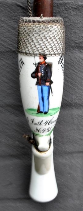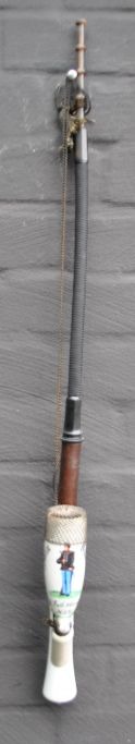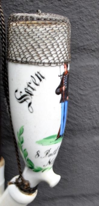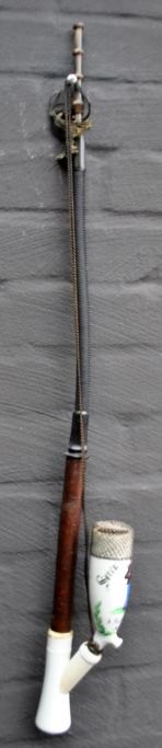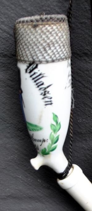 Danish porcelain soldier's pipe, 1878, Copenhagen. Painted white porcelain. Painted with the text: Søren Villadsen, 8 Batl. 4 Comp. N: 431. Remembrance from the camp in Dyrehaven. With a pipe of turned wood and braided horsehair. With iron grate at the mouth of the pipe. Mouthpiece of horn. L.: 70 cm.Item number: 28511