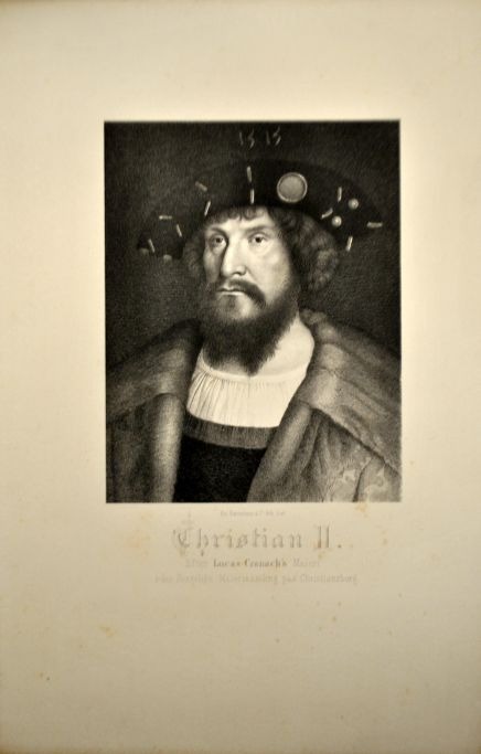 Bærentzen, Emil ( 1799 - 1868 ) Denmark: Portrait of King Christian II. After Lucas Cranach's painting in the Royal Collection of Paintings. Lithograph. Print: 15.5 x 12 cm.Unframed.