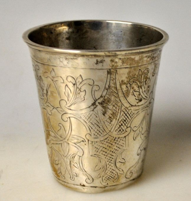 Jens Kieldsen Sommerfeldt (1692 - 1772) Silversmith in Aalborg, Denmark: Silver cup. With cartouche. Stamped. Height: 7.5 cm. Weight: 79 grams.Item number: 28671