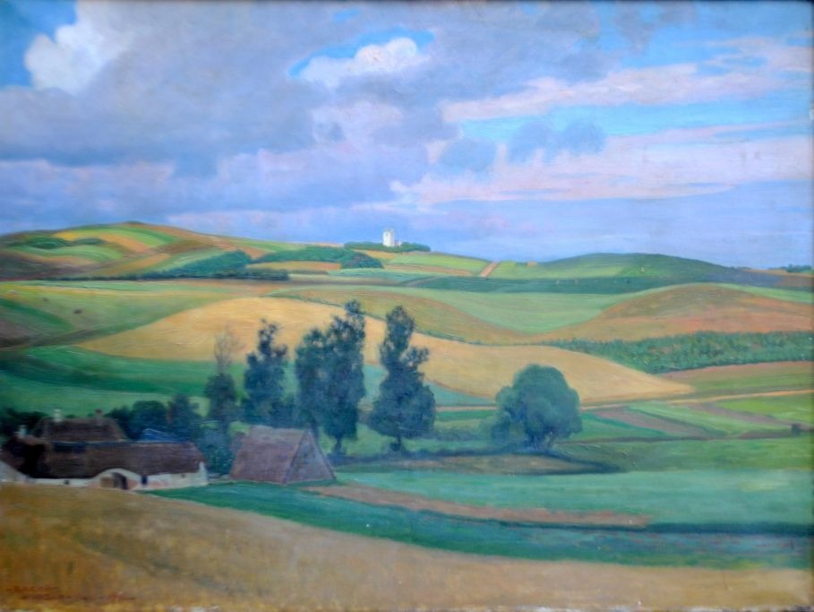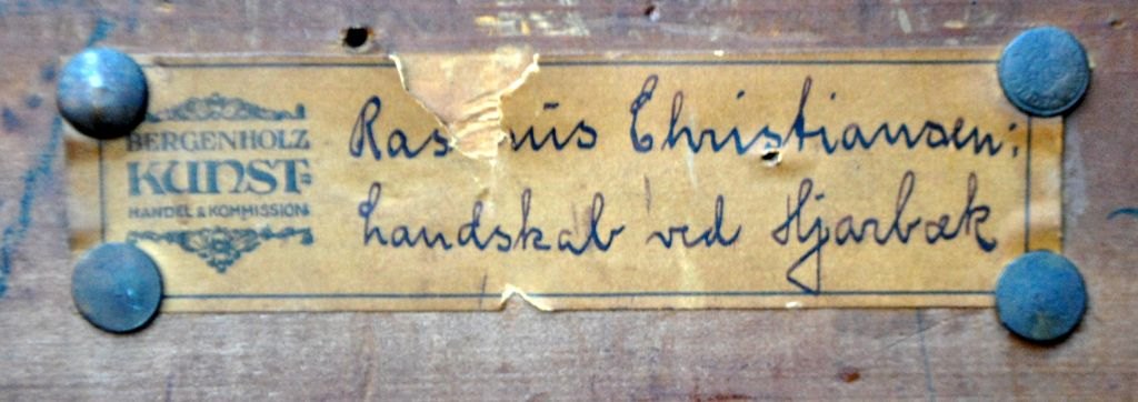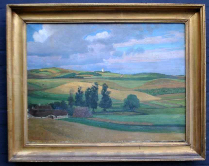 Christiansen, Rasmus (1863 - 1940) Danmark: Landskab ved Hjarbæk, 1916. Olie på lærred. Signeret: RxCHR - Hjarbæk - juli - 1916. H: 56 cm. B: 106 cm.Indrammet: H: 70 cm. B: 86 cm.