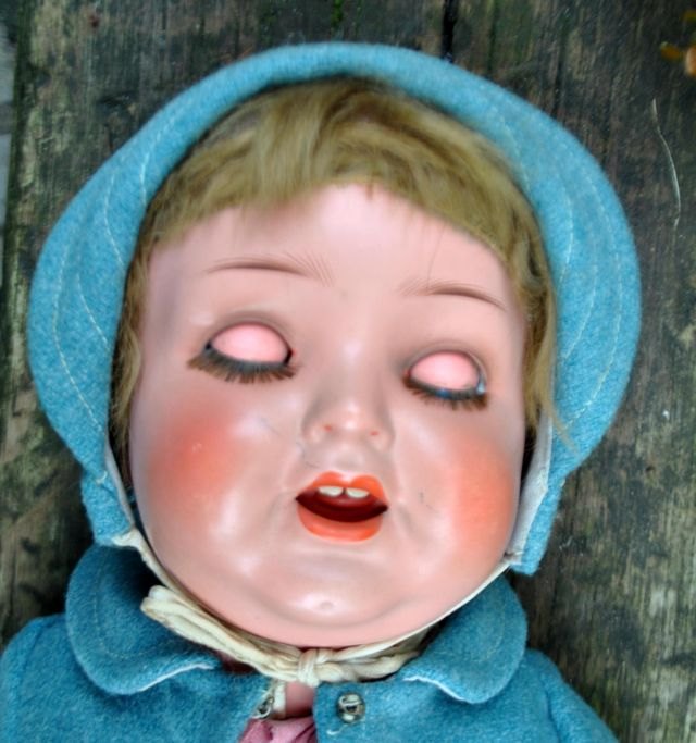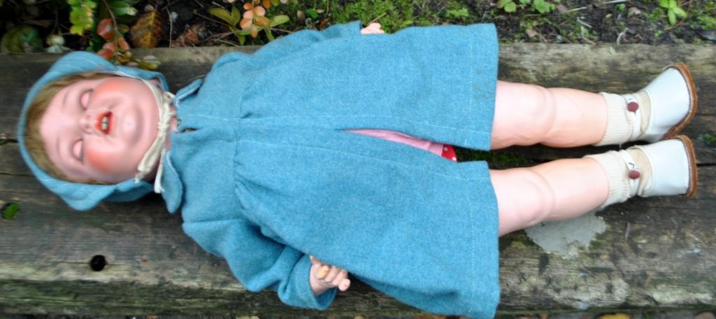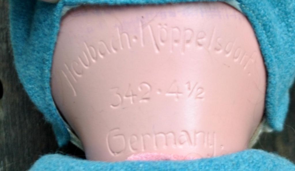 Large Heubach - Köppelsdorf doll 342.4 1/2, 20th century. Germany. Stamped. Head and body of composite material. Blue eyes that can open and close, with lashes of hair. Clothes in wool and shoes in patent leather and leather soles. L: 60 cm.NB: the arms are loose