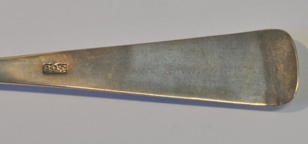 Peter Johannesen Petersen (1805 - 1873) Aabenraa, Denmark: Silver spoon with green glass. Stamped. L.: 23 cm. With engravings on the handle. With engraving: J. Jepsen, Eken den 9.9.1897.Item number: 28760