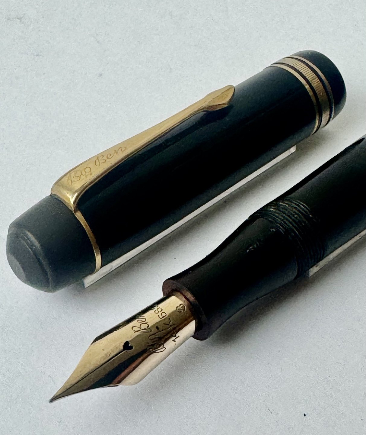 Stor sort Big Ben no. 8 fyldepen med push button filler. Fremstår i god stand uden skader eller reparationer. Alle dele originale BB dele inklusiv en kæmpe guldspids i 14 karat. Der skal indsættes ny gummisæk så pennen igen kan optage blæk og skrive igen. Fyldepennen måler 13,7 cm i længde og hættens åbningsdismeter er 1,3 cm.Ny gummisæk kan indsættes for et tillæg i prisen på kr. 200,-