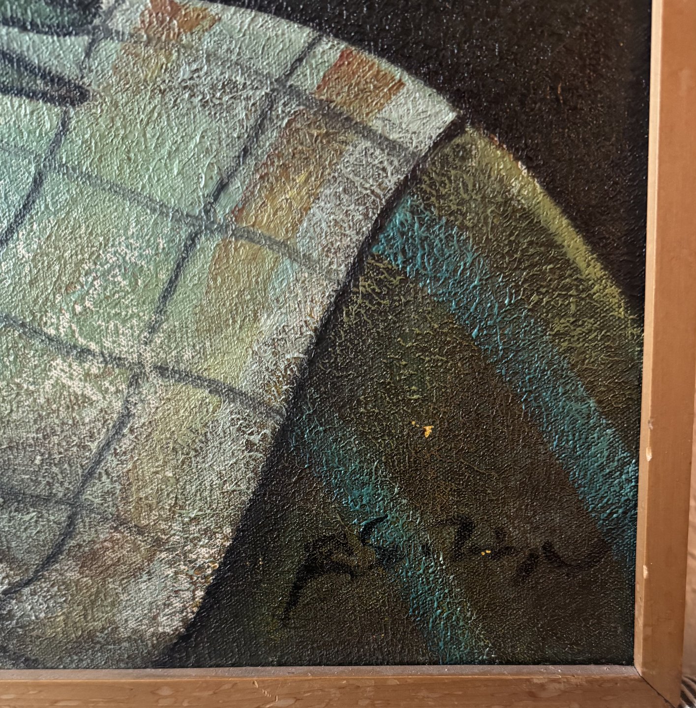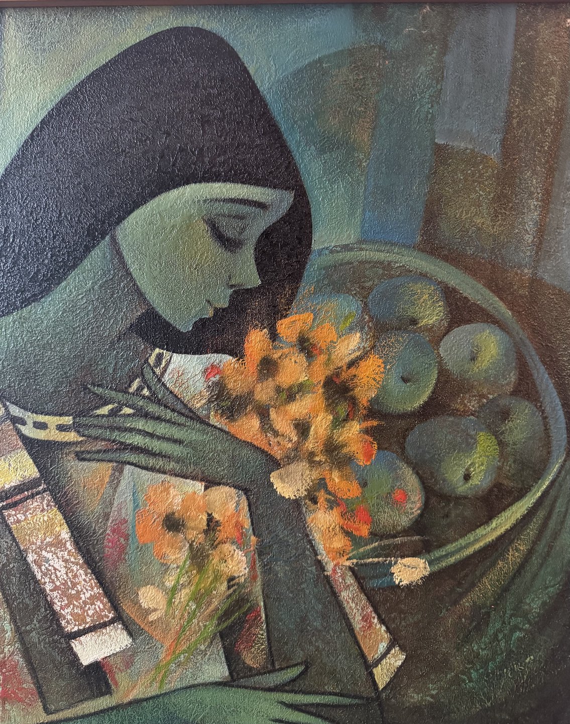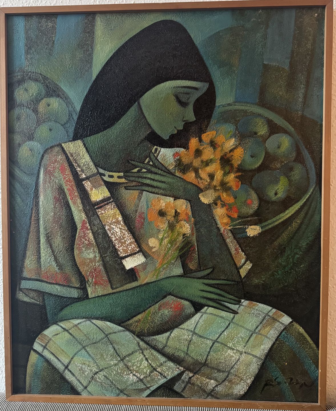 Painting by Filipino artist Roger San Miguel.Portrait of a young woman with a bouquet of flowers and baskets of apples around her. Dimensions: 61.5 x 75.5 cm.