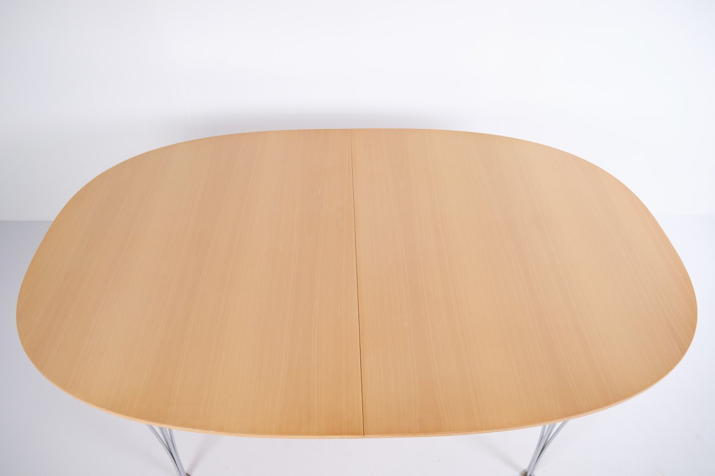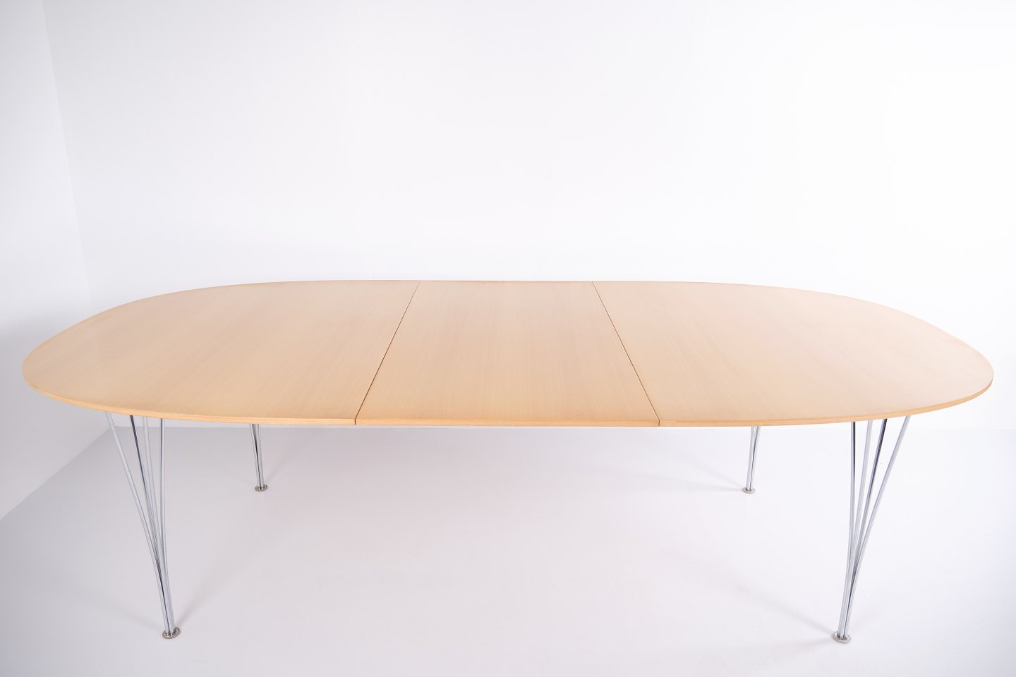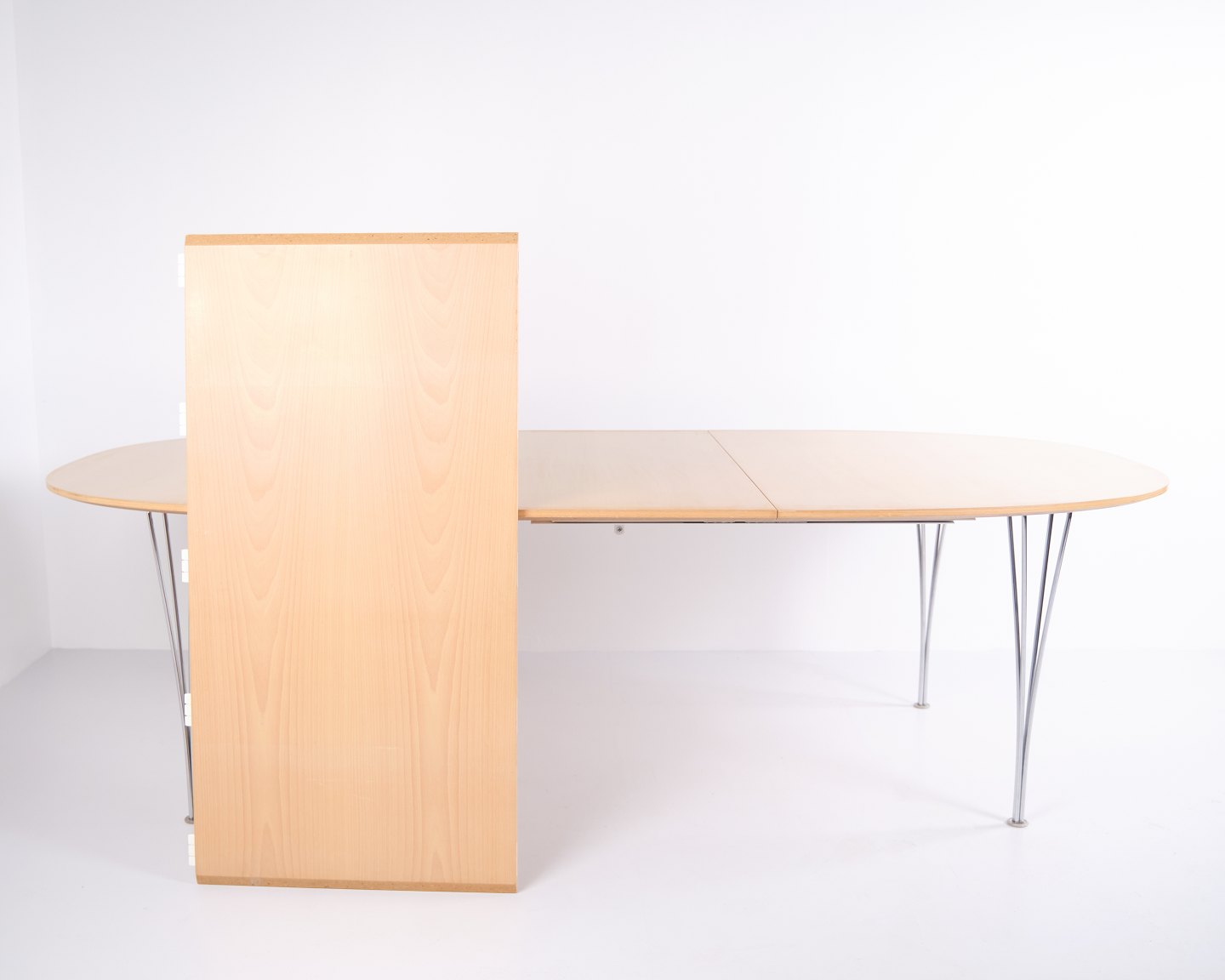 Super Ellipse dining table by Piet Hein & Bruno Mathsson for Fritz Hansen. Beech wood with 2 extension leaves. Produced in 2001.— Designers: Piet Hein & Bruno Mathsson