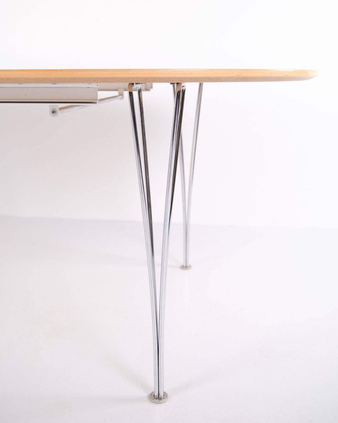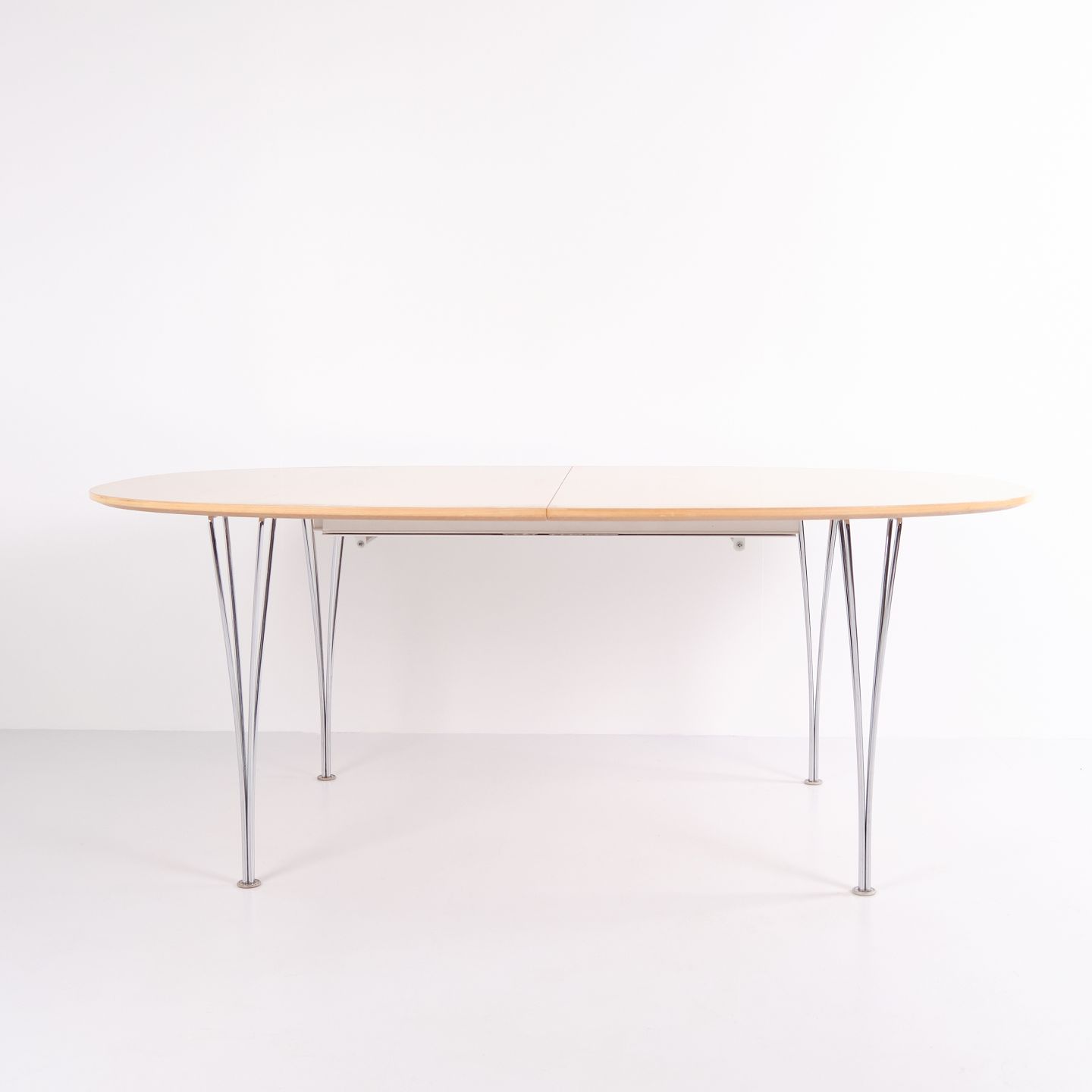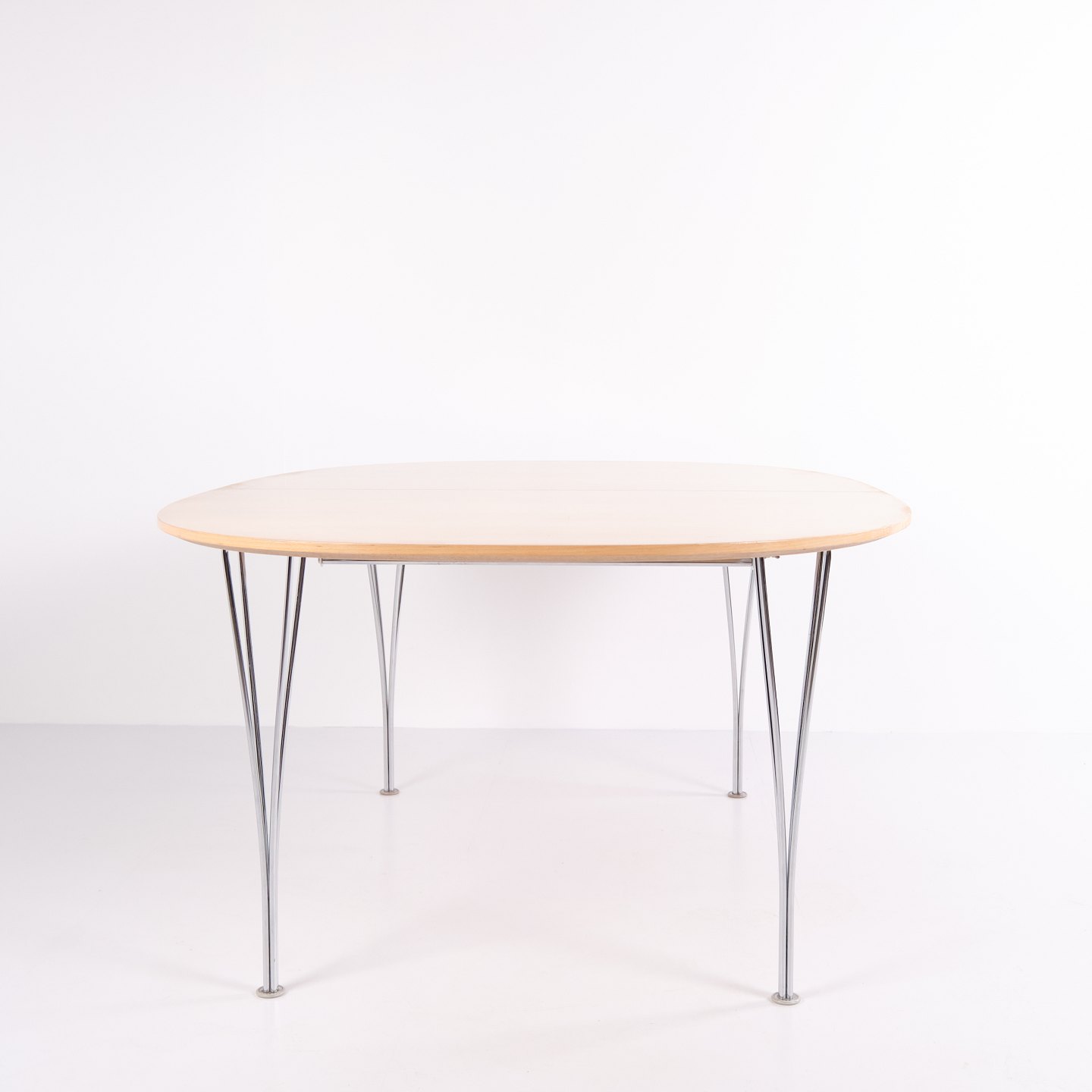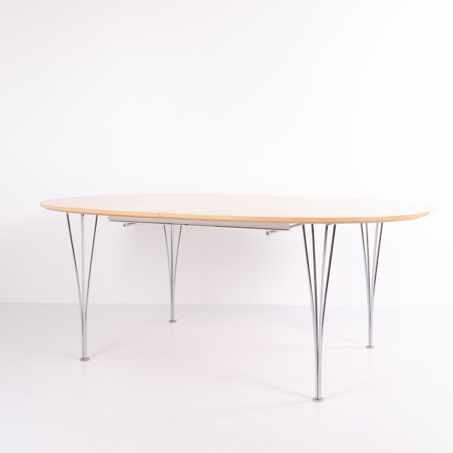Super Ellipse dining table by Piet Hein & Bruno Mathsson for Fritz Hansen. Beech wood with 2 extension leaves. Produced in 2001.— Designers: Piet Hein & Bruno Mathsson
