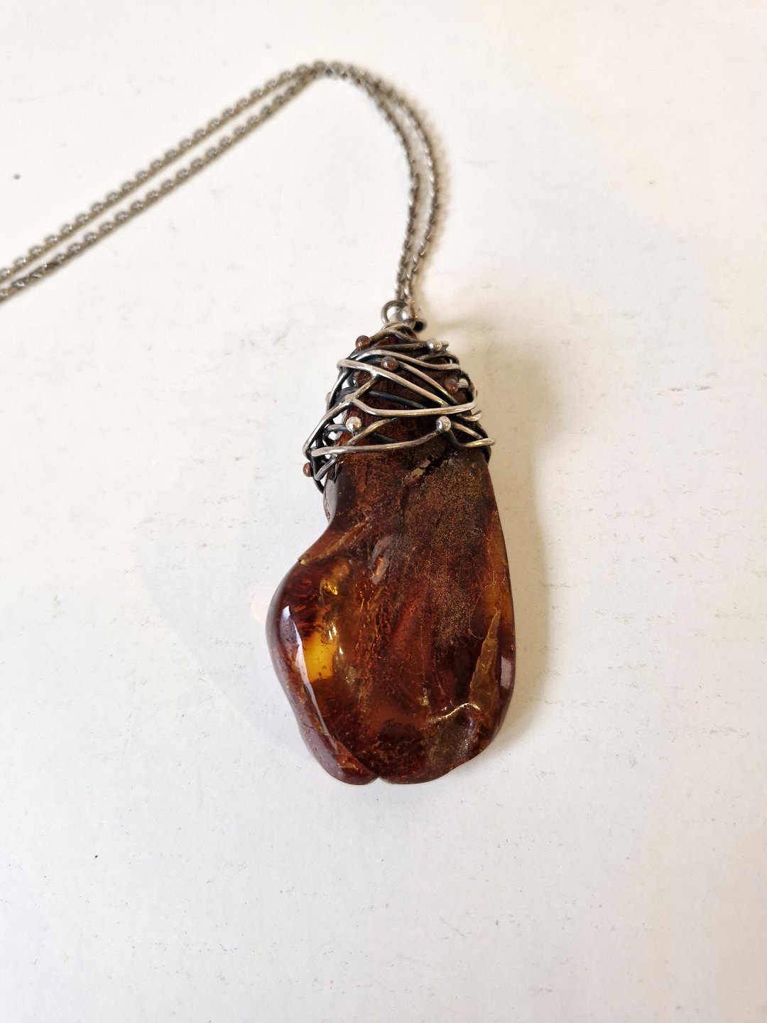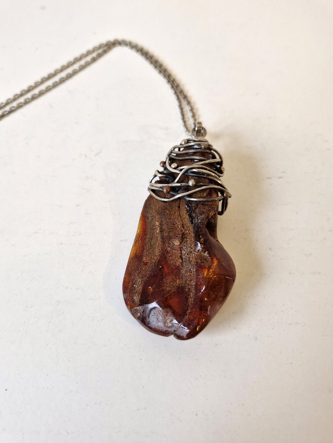 Silver necklace with large amber pendant wrapped with silver thread. Stamped 925. Dimensions of the amber lump 4 x 8 cm.Length of the necklace 60 cm. Width 2 mm.