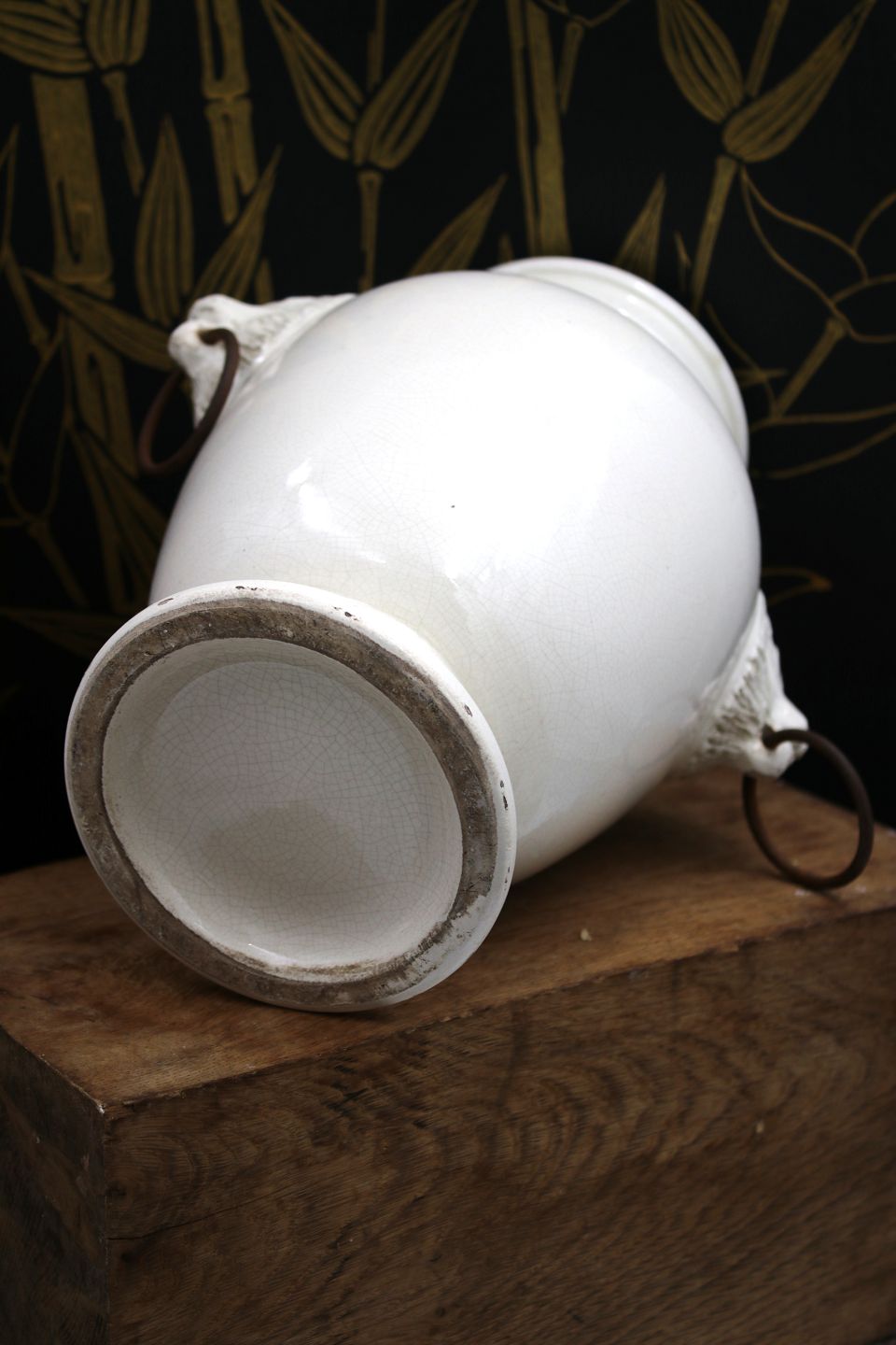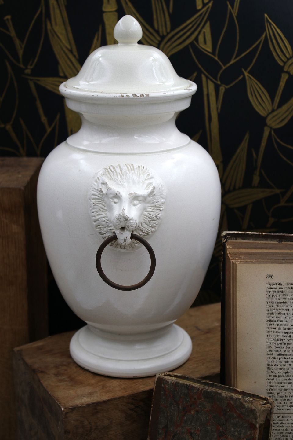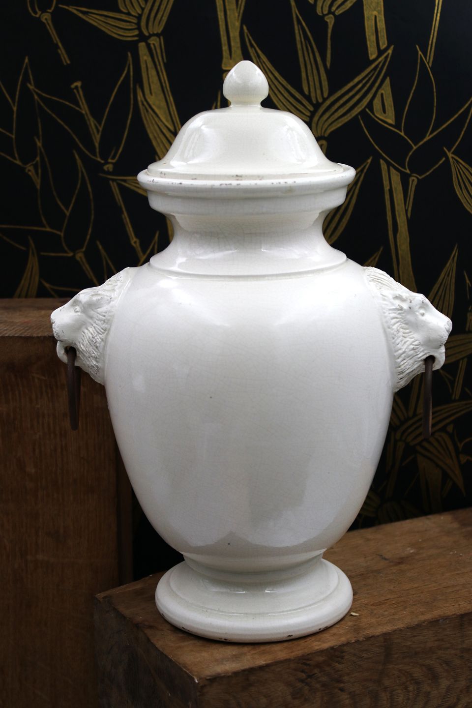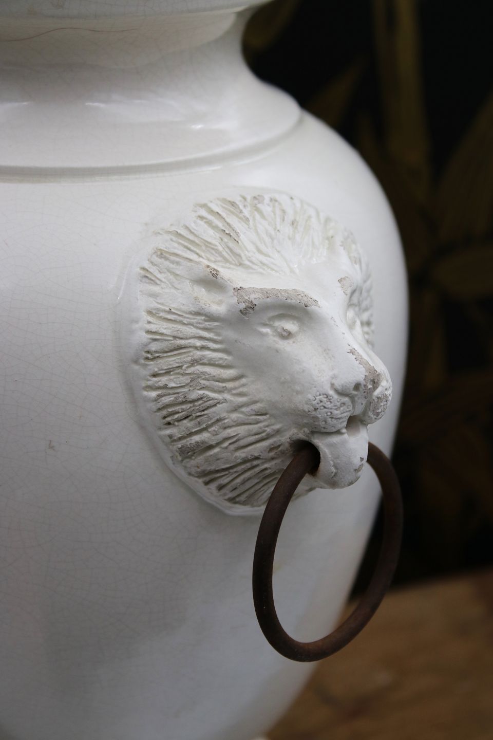 Old glazed stoneware lidded jar with lion heads on the side.The jar has a nice old patina and measures: H: 32cm.