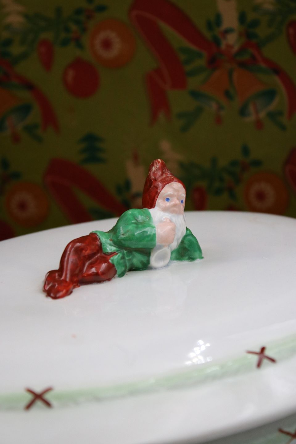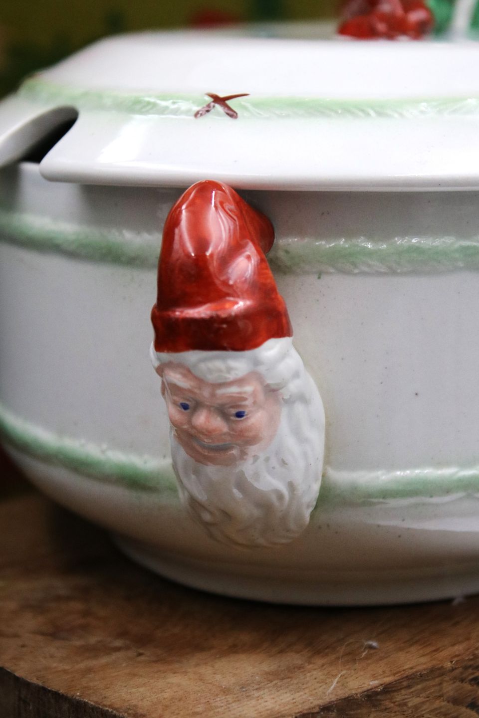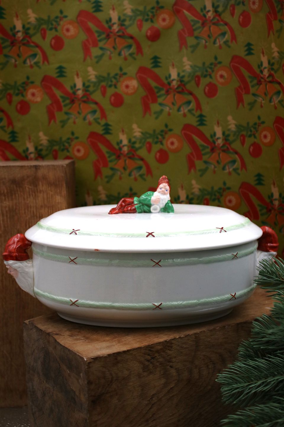 Antique, Swedish oval manor house Christmas tureen in faiencewith a colored gnome lying on top of the lid and 2 gnome heads as handles on the side. H: 14.5cm. L&W: 30.5x19cm.