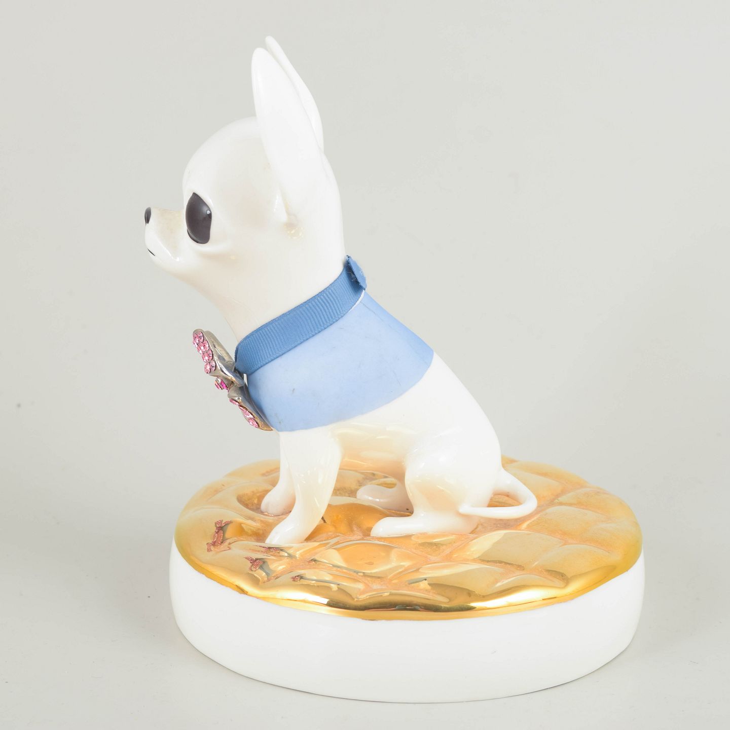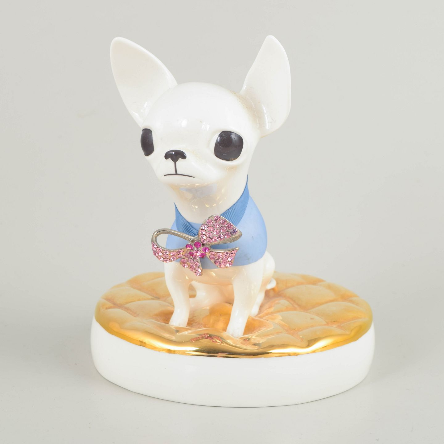 Uta Koloczek for Goebel Chihuahua, limited edition 42/100, 2000sDecorative porcelain figure depicting a chihuahua, executed in glossy glazed porcelain with painted decoration and an applied bow set with rhinestones. The figure stands on a cushion-shaped base with a gold-coloured surface. Produced by Goebel in a limited edition of 100 pieces.