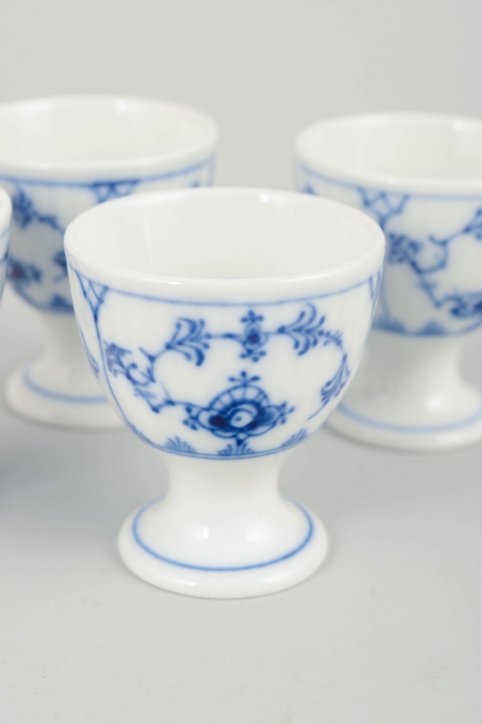 Royal Copenhagen Blue Fluted Plain egg cups, set of 4, 1920s.Set of four classic egg cups in Blue Fluted Plain, made in the traditional fluted form with pedestal foot and decorated with hand-painted cobalt blue underglaze. The egg cups feature elegant proportions typical of early 20th-century tableware.