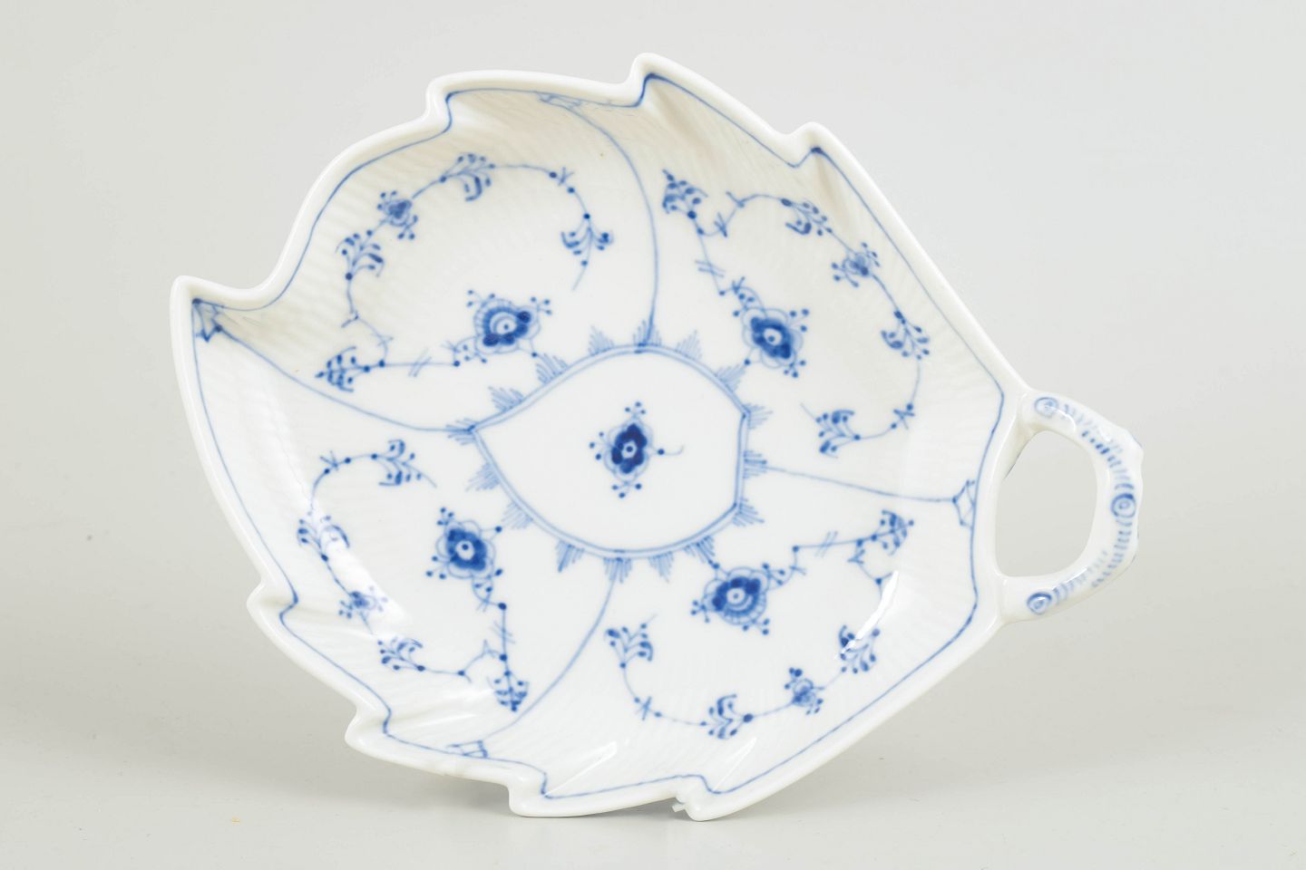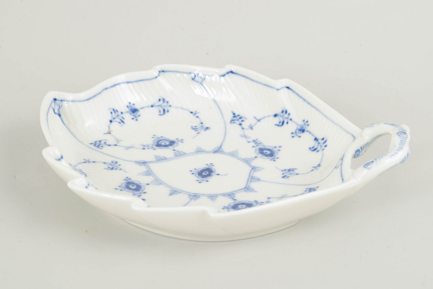 Royal Copenhagen Blue Fluted Plain dish with handle, 1966.Decorative dish in Blue Fluted Plain, made in a leaf-shaped form with an integrated handle and gently scalloped rim. The dish is decorated with hand-painted cobalt blue underglaze in the classic fluted pattern and combines sculptural form with practical use. A characterful and relatively rare serving piece within the service.