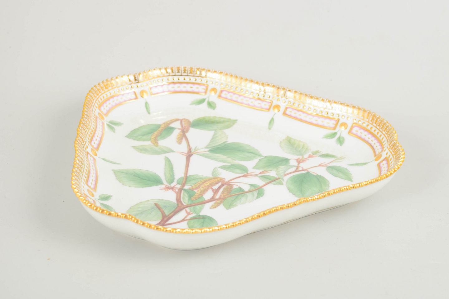 Royal Copenhagen Flora Danica triangular dish, 1963.Elegant dish from the iconic Flora Danica service, hand-painted with a botanical motif derived from the Flora Danica publication. The dish is executed in the service’s characteristic refined form with a decorative rim and a balanced, organic contour. A classic serving piece suitable for smaller servings or as part of a complete Flora Danica service.
