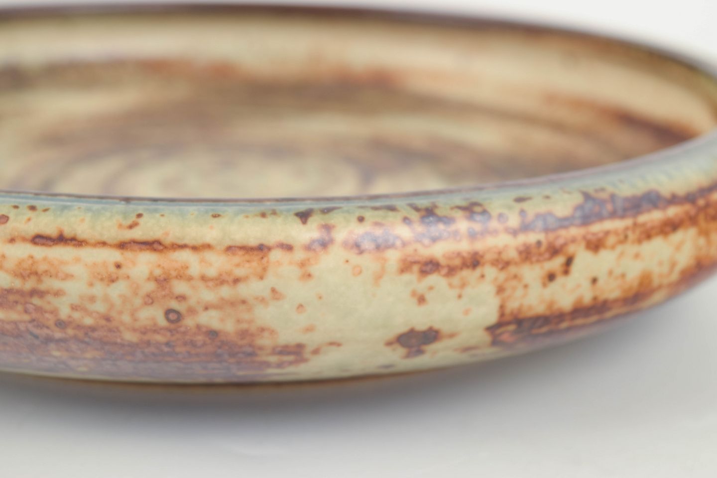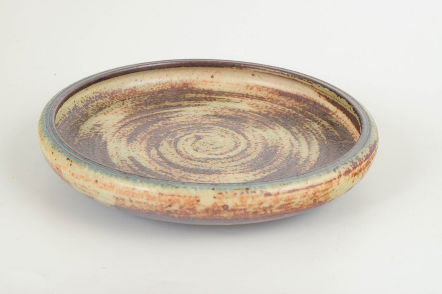 Carl Halier for Royal Copenhagen Bowl / Dish.Large, low stoneware bowl featuring a pronounced concentric pattern and a richly textured glaze in light sand tones combined with dark brown and grey hues. The circular composition and dynamic glaze effects create a strong graphic yet organic expression, characteristic of Royal Copenhagen’s 1970s stoneware.