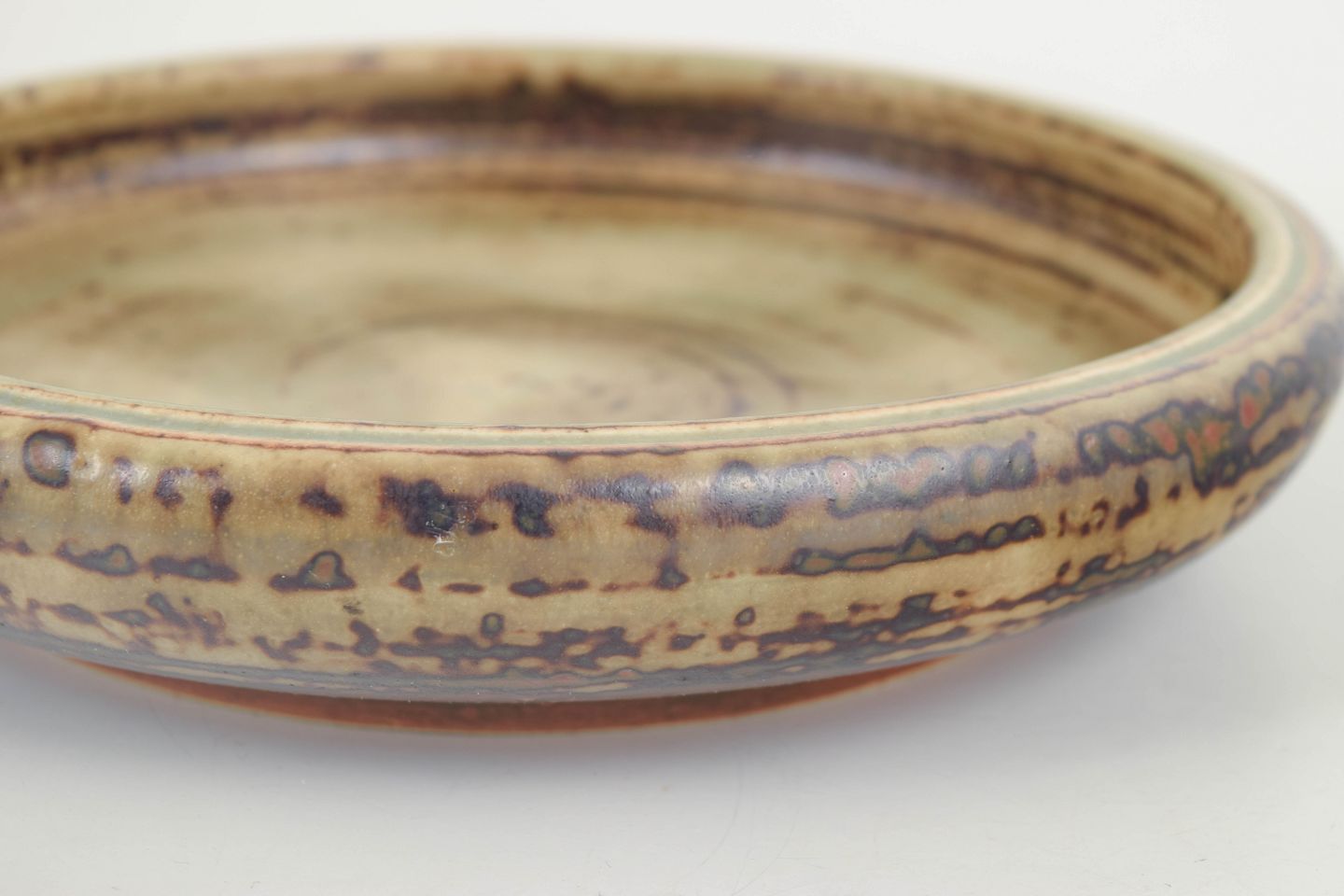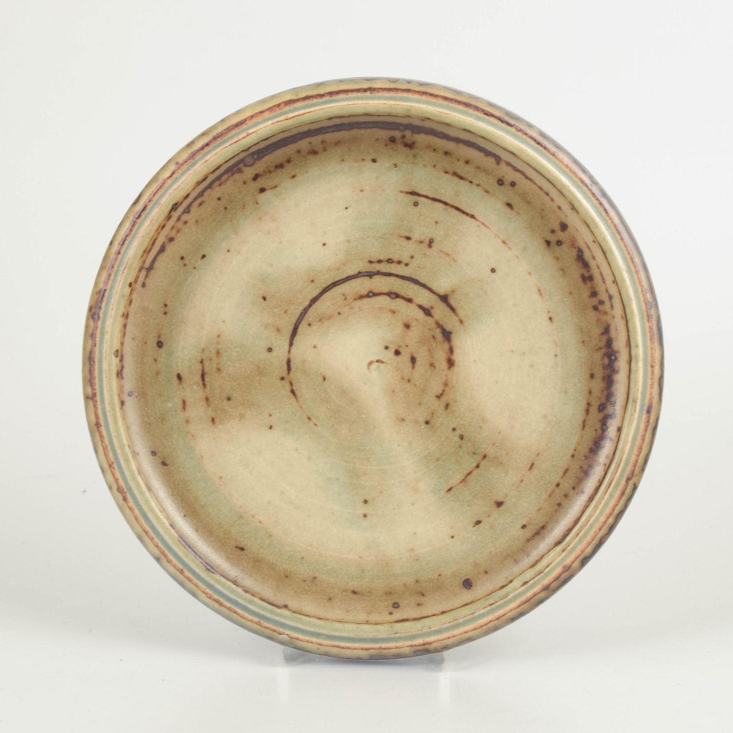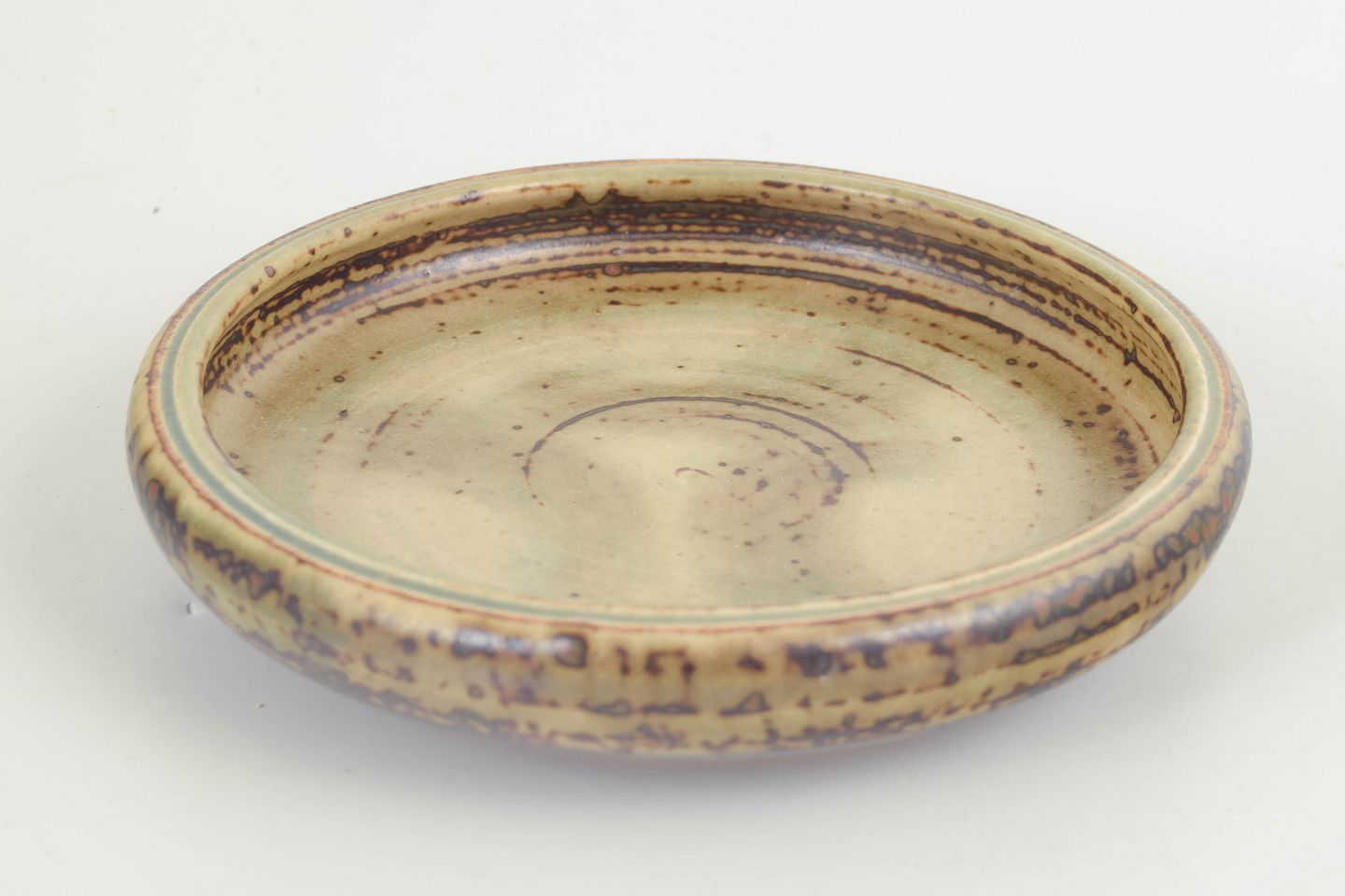 Carl Halier for Royal Copenhagen Bowl / Dish.Low, wide stoneware bowl with a calm circular form and a subtle glaze in light sand and soft green tones, accented by fine brown speckling and concentric throwing marks. The design is restrained and balanced, emphasising surface, material, and the natural variation of the glaze.