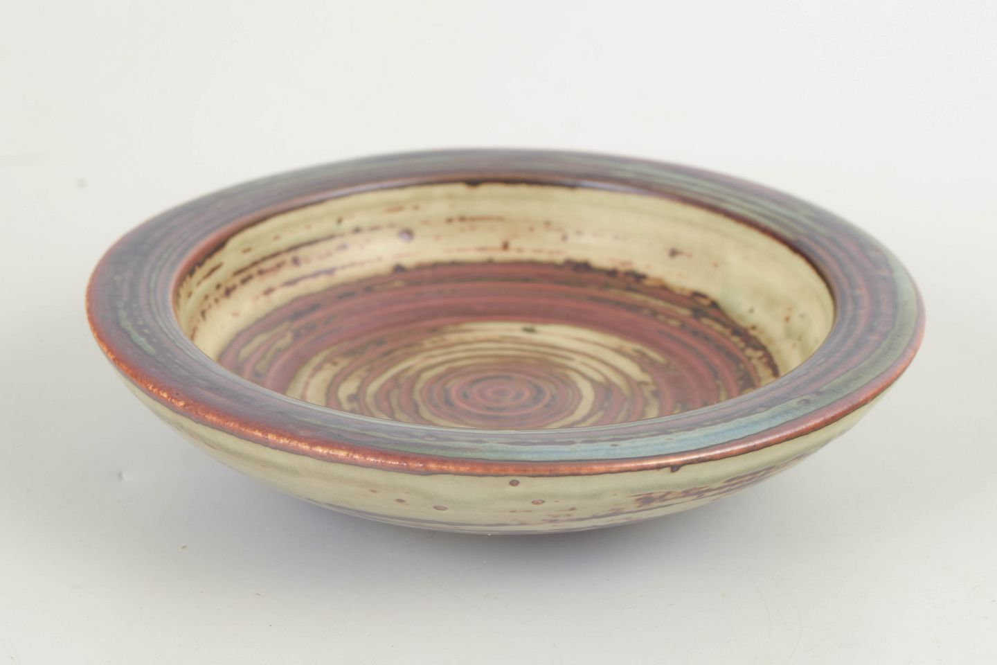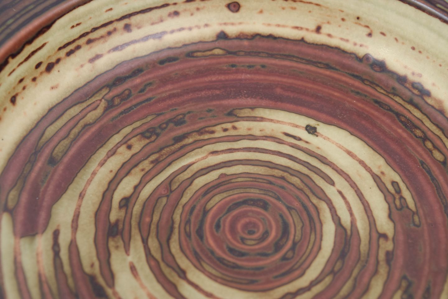 Kresten Bloch for Royal Copenhagen Bowl / Dish, 1970s.Low stoneware bowl featuring a pronounced concentric pattern and a dynamic glaze in warm earthy tones combined with green and brown hues. The visible wheel marks and circular construction create a graphic yet organic expression, characteristic of Royal Copenhagen’s stoneware from the 1970s.