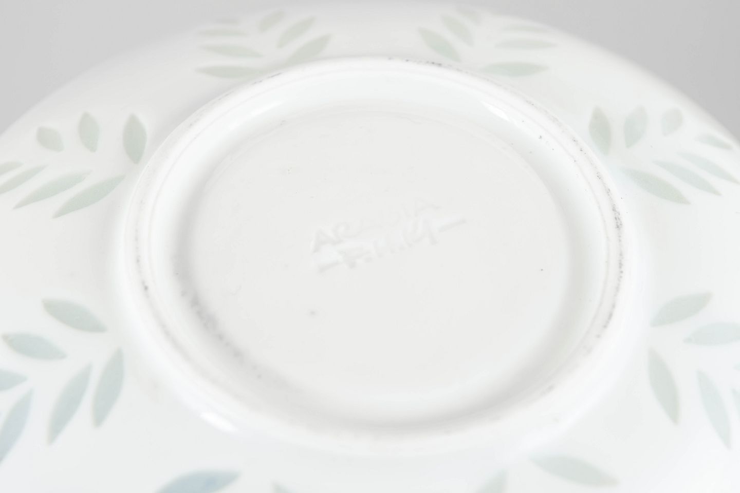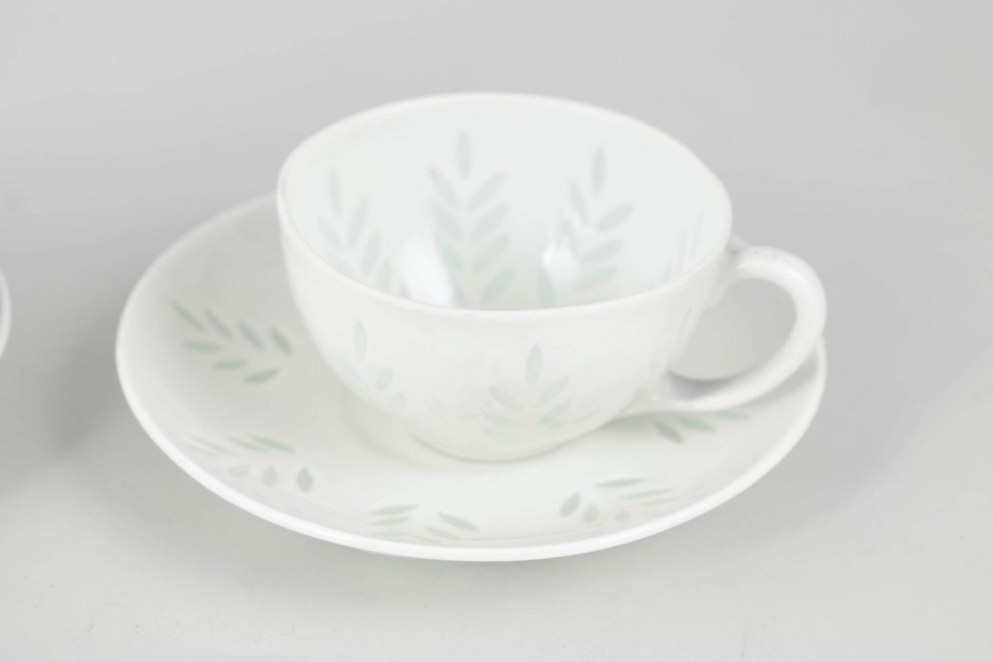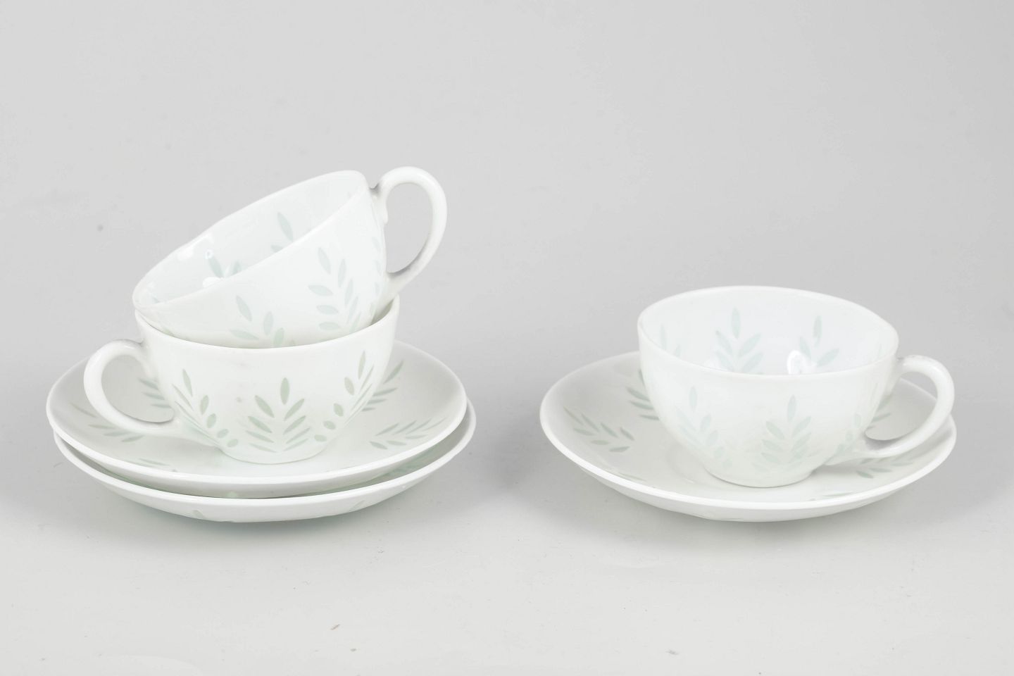 Elegant set consisting of three mocha cups with matching saucers in white porcelain, decorated with subtle leaf ornamentation executed in transparent, lightly green-tinted glaze fields. The light and refined expression combined with soft forms is characteristic of Friedl Holzer-Kjellberg’s late porcelain production for Arabia.