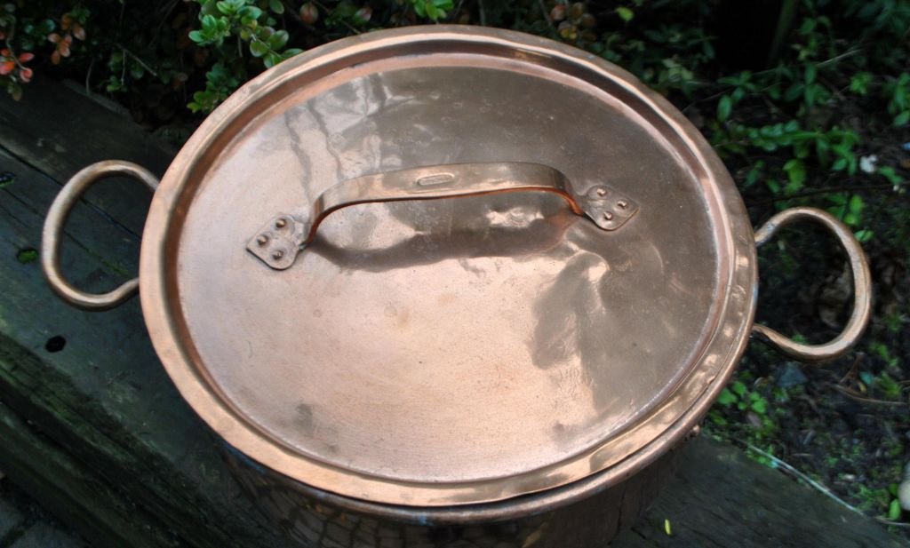 Large antique copper pot with handle and lid, 19th century. The lid is stamped. Inside tinned. H.: 32 cm. Dia.: 33 cm.Item number: 28563