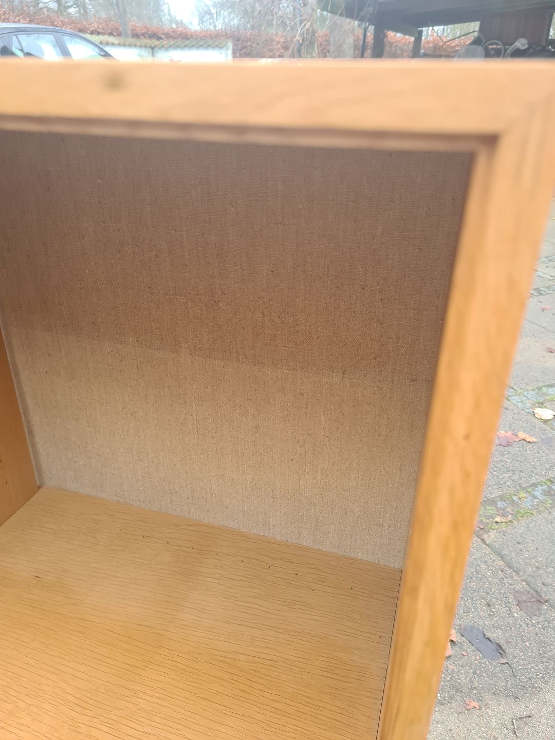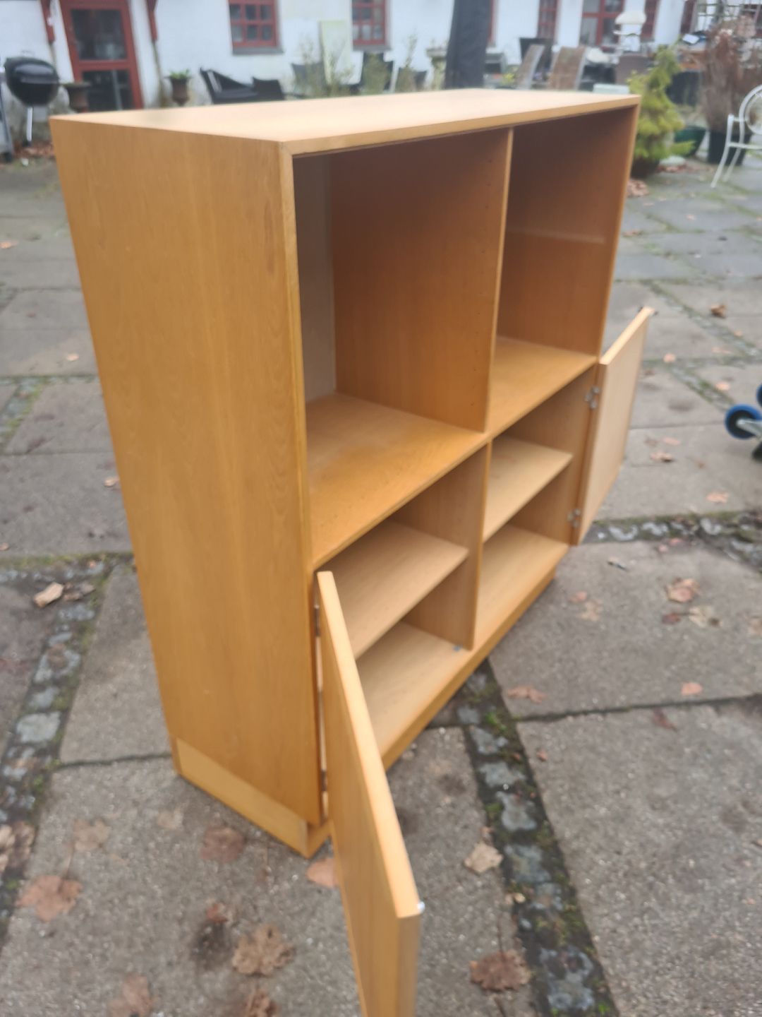 Reol i finéret eg med underskab og hessian beklædt bagbeklædning. Ydført hos HG Funiture i 1970'erne. Fremstår pæn og velholdt uden de store brugsspor. Højde 112 cm. Bredde 101 cm. Dybde 36 cm.