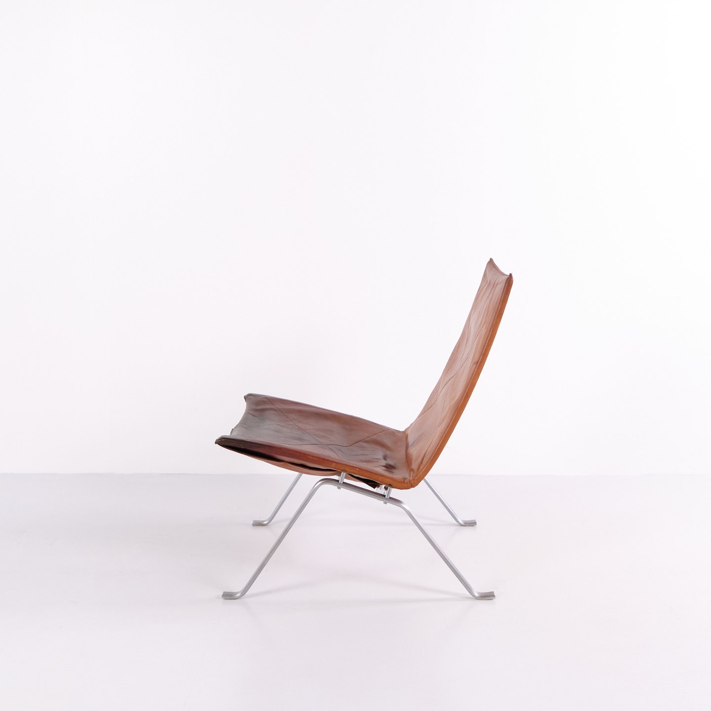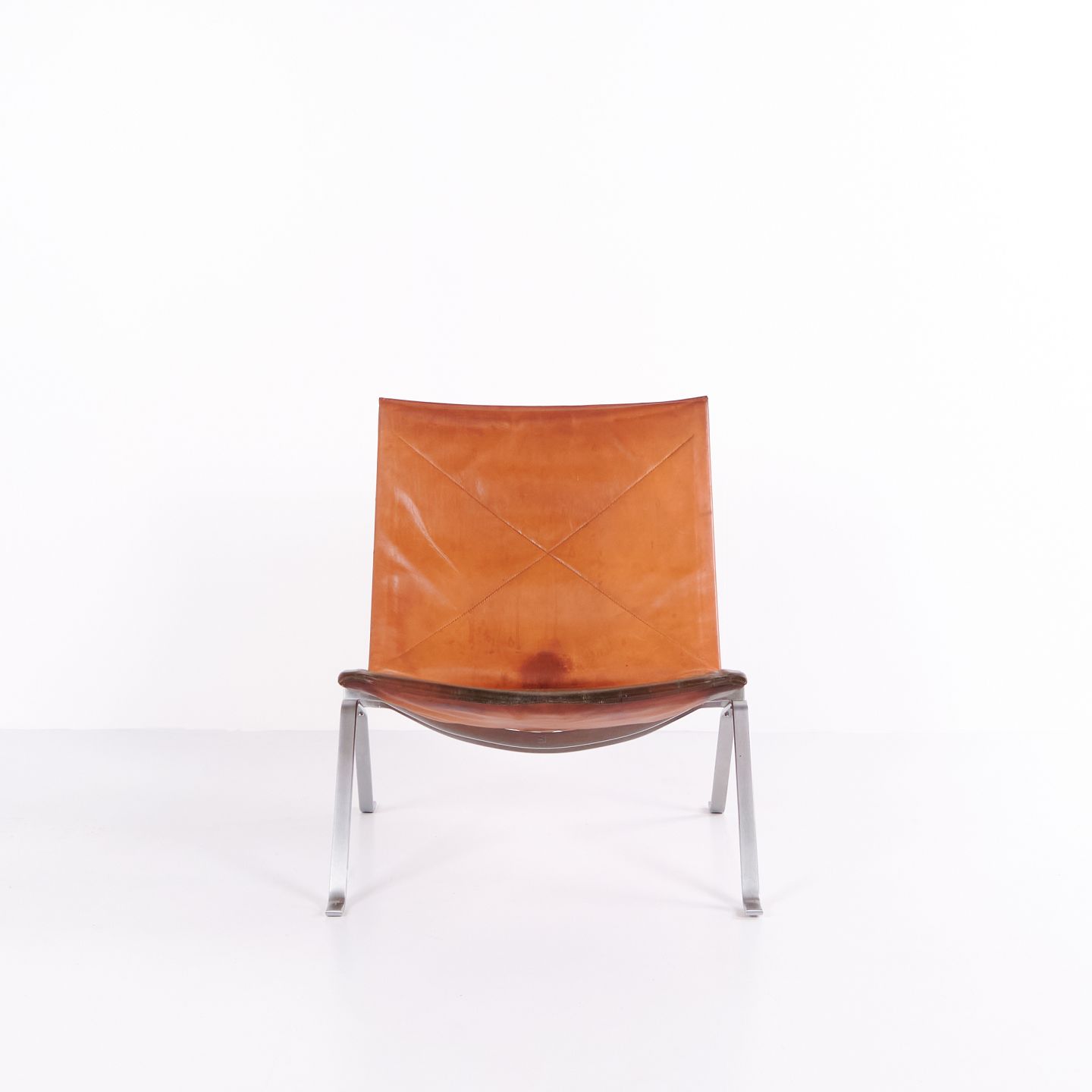 PK22 armchair by Poul Kjærholm for E. Kold Christensen. Original upholstery in patinated cognac leather. Danish design icon from the 1950s.— Designer: Poul Kjærholm
