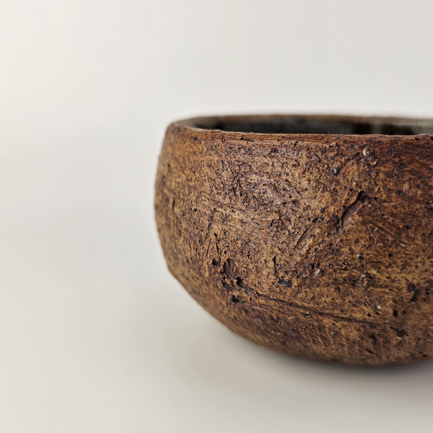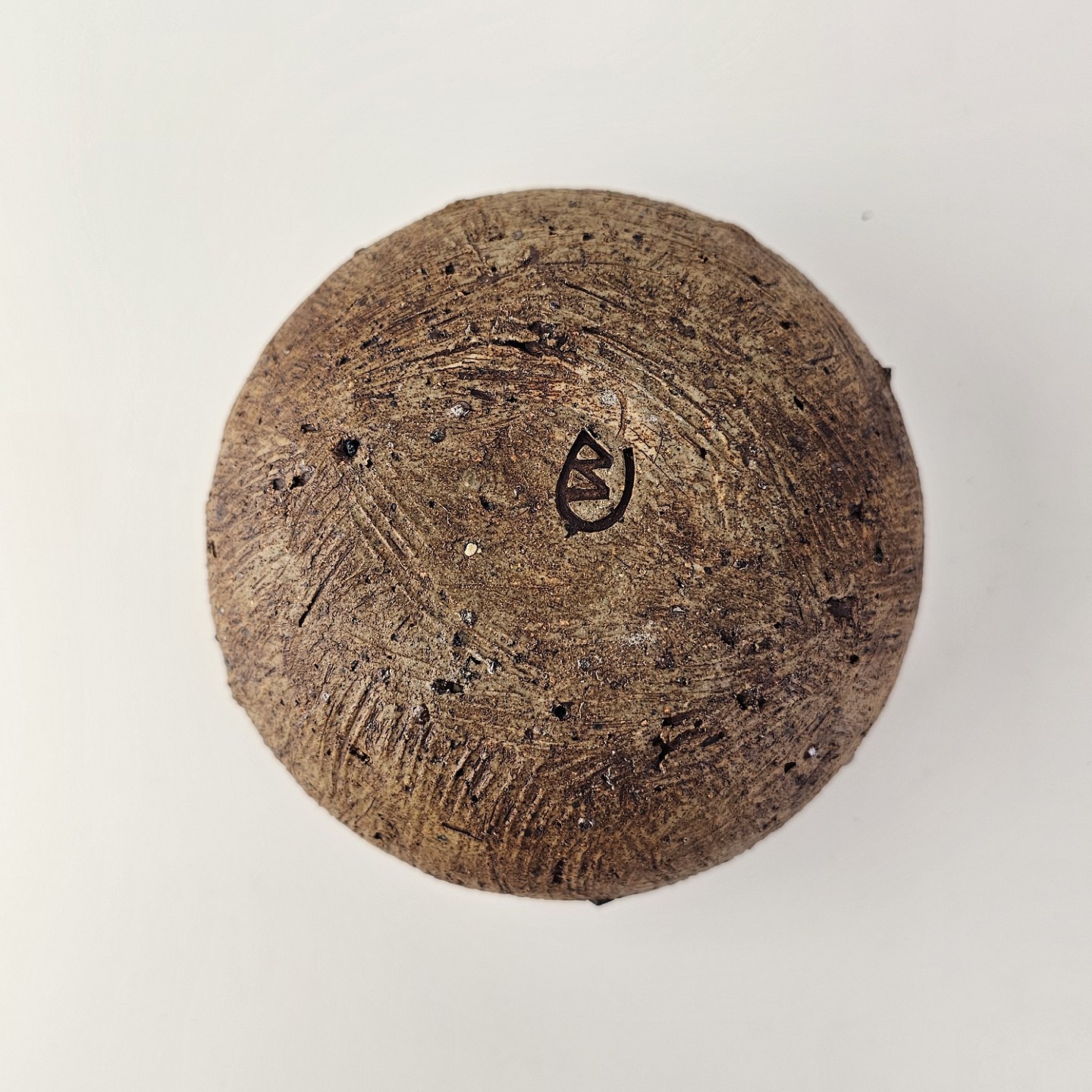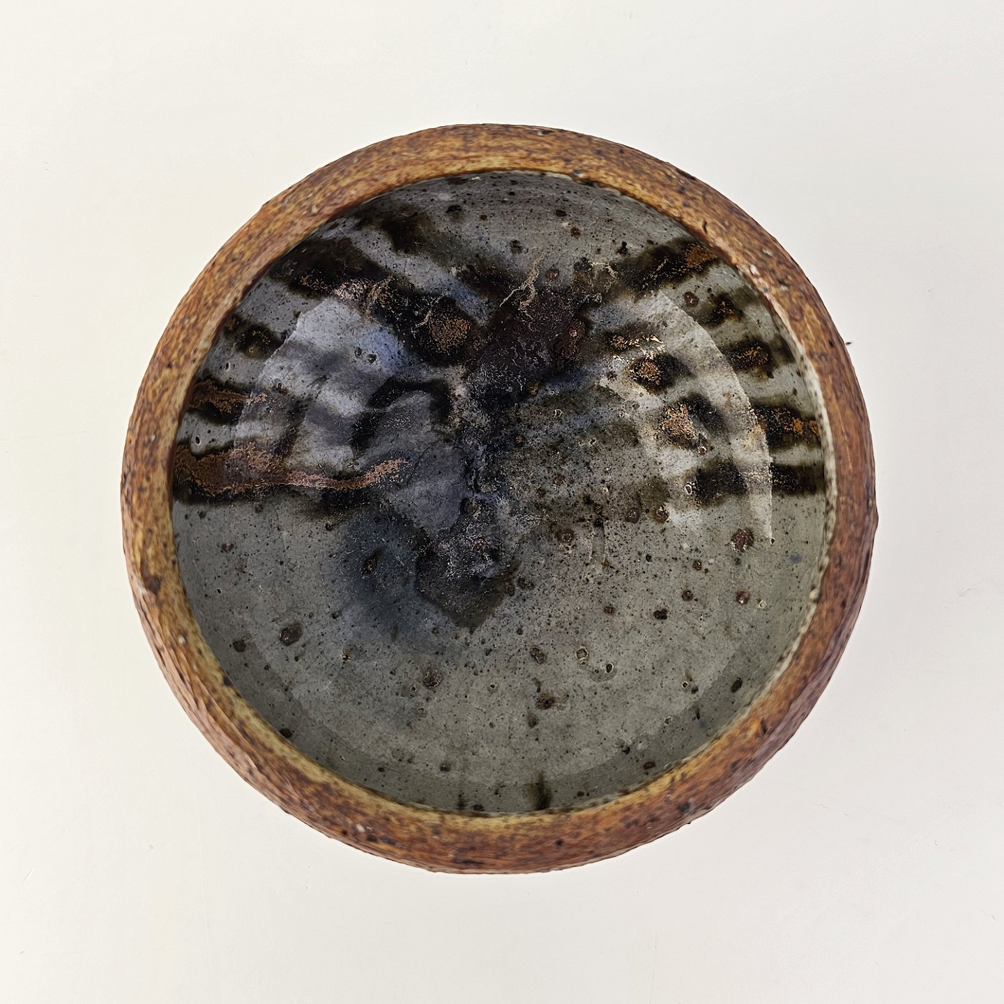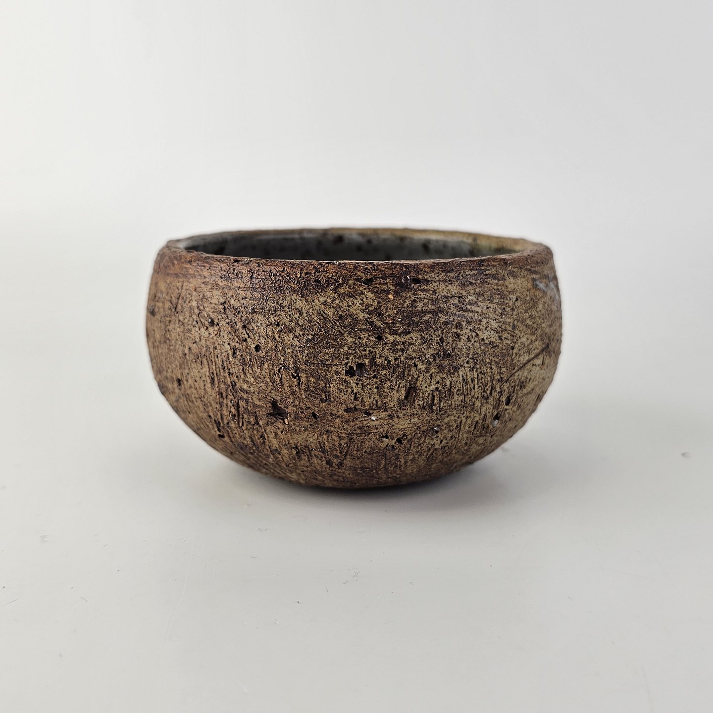 Lille keramik skål der er uglasseret udvendigt, og stribet mønster indvendigtSigneret CW