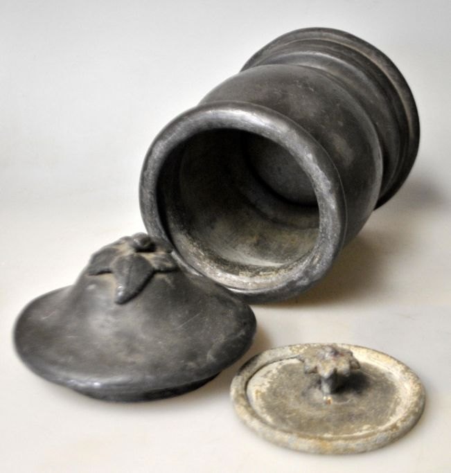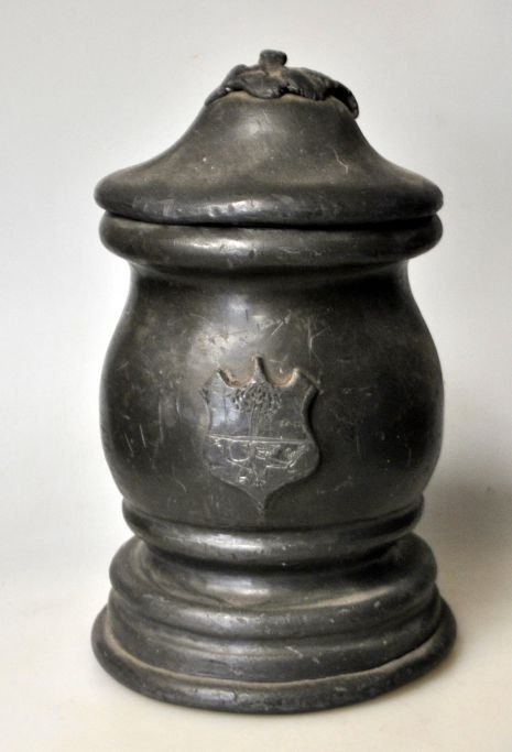 Baroque pewter tobacco container, 18th century. With coat of arms on the side. Inside with weight. Lid with foliage. H: 18 cm.