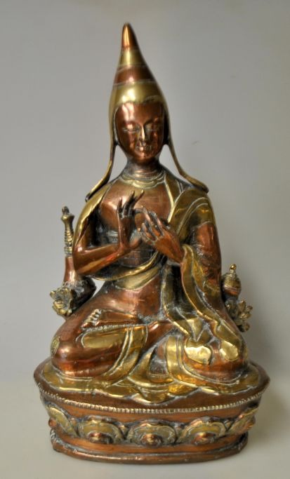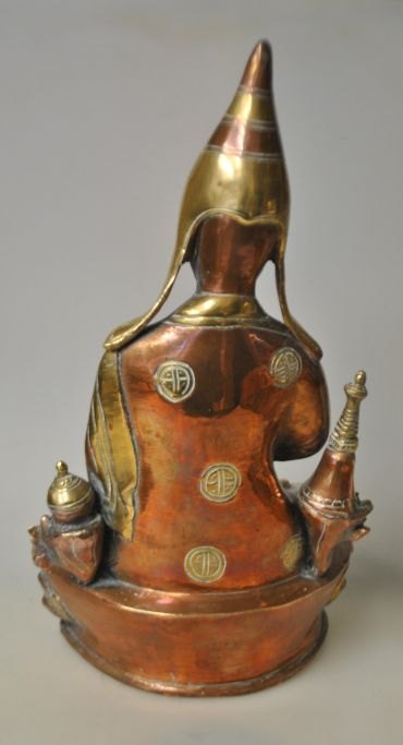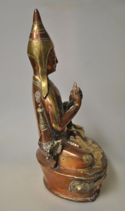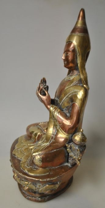 Sitting Tibetan Lama, sculpture, ca. 1950. Nepal. Probably Tsongkhapa, Made of bronze and copper. Stamped. H.: 30.5 cm.Sitting in padmasana on a lotus base.