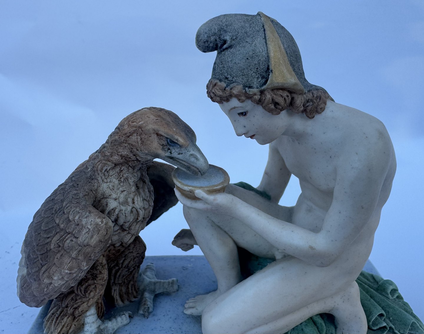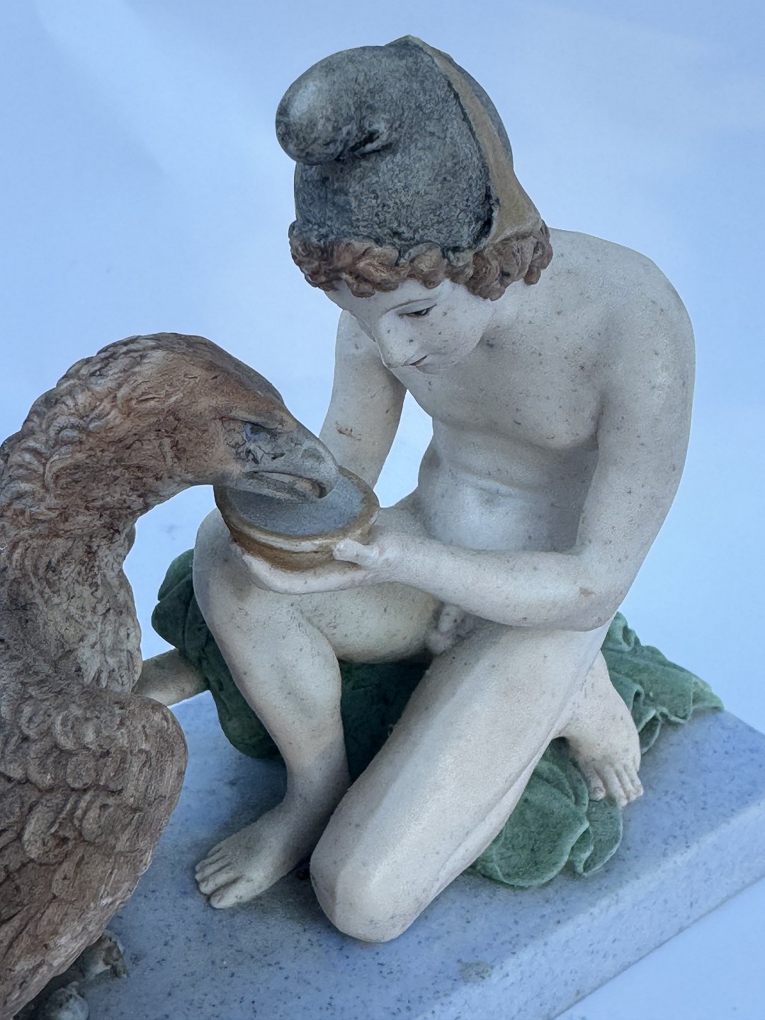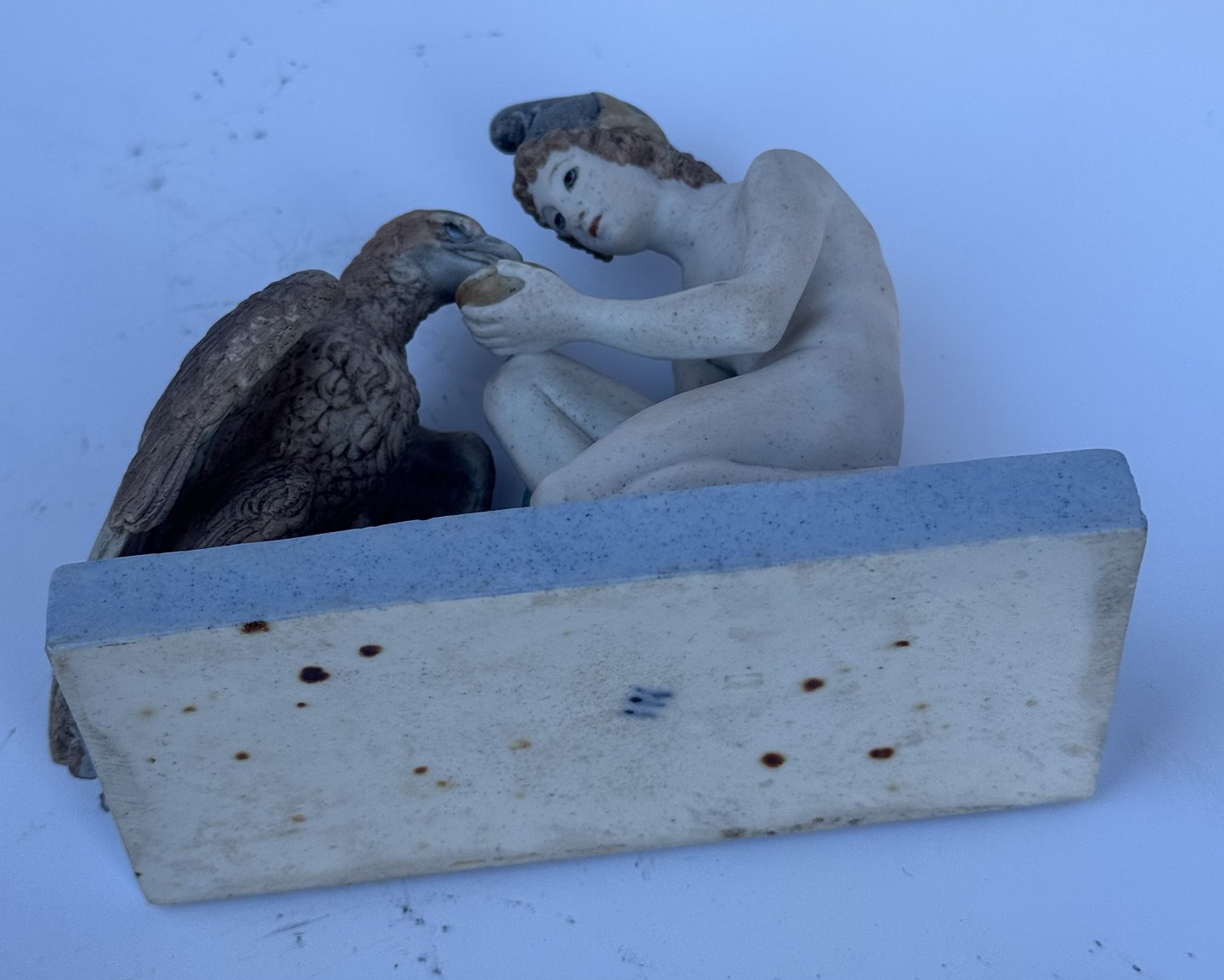 Figure in painted bisque porcelain depicting Ganymede with Jupiter's (Zeus' according to Greek mythology) eagle by Bertel Thorvaldsen (1770-1844) Designed in Rome 1817-18. This reproduction was produced by Royal Copenhagen in the late 19th century. According to Greek mythology, Zeus' (Jupiter's) eagle abducts Ganymede in order to make him the cupbearer (servant) of the gods. Factory mark on the bottom with the factory's well-known three blue waves. The figure is missing Ganymede's jug in his right hand, and there is a small chip on the eagle's tail. Dimensions: H. 11 cm. The base measures 6 x 12.5 cm.This painted version may have been exhibited, together with other of Thorvaldsen's white Bisquit figures, at the great World Exhibition in Paris in 1900.