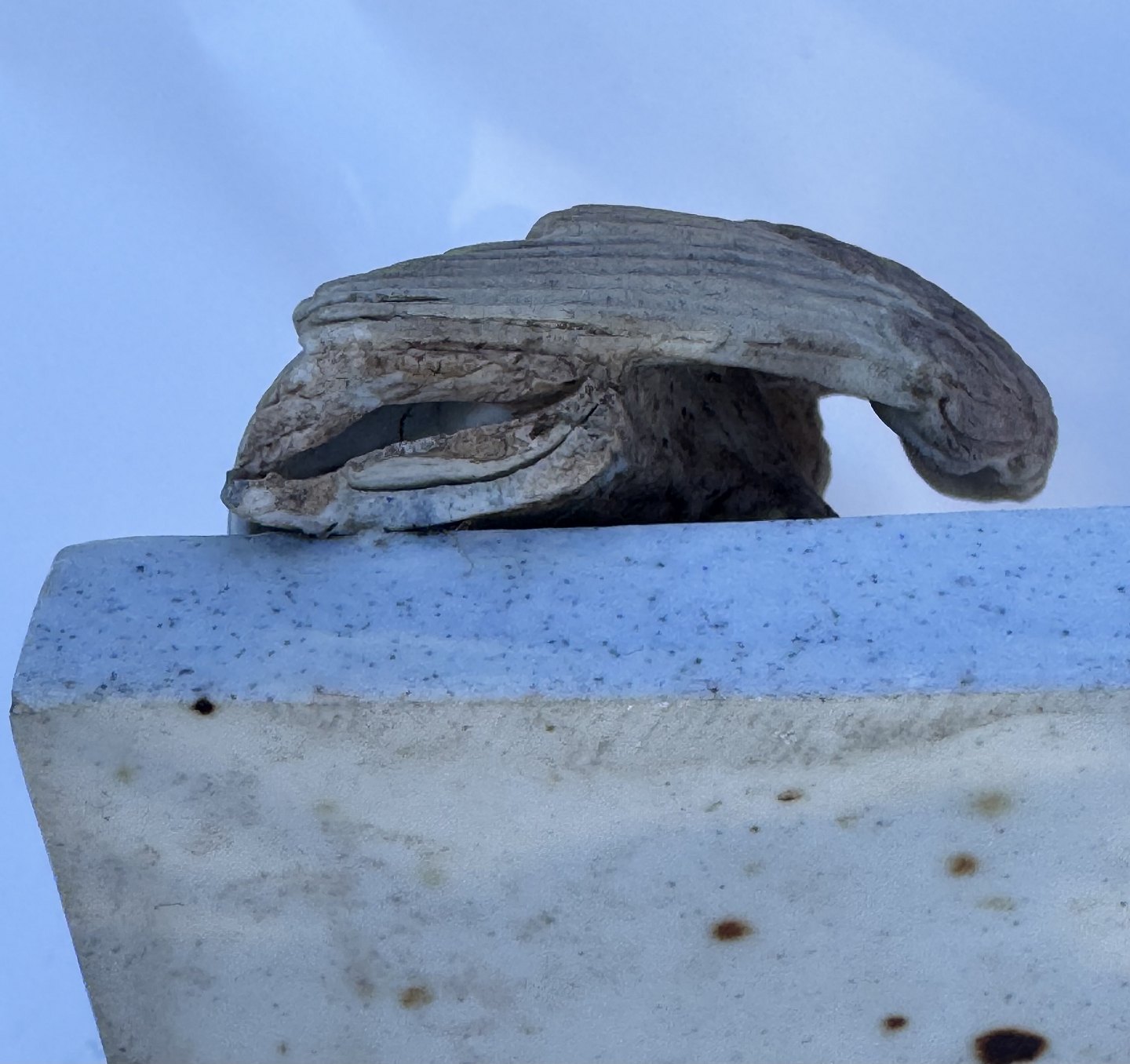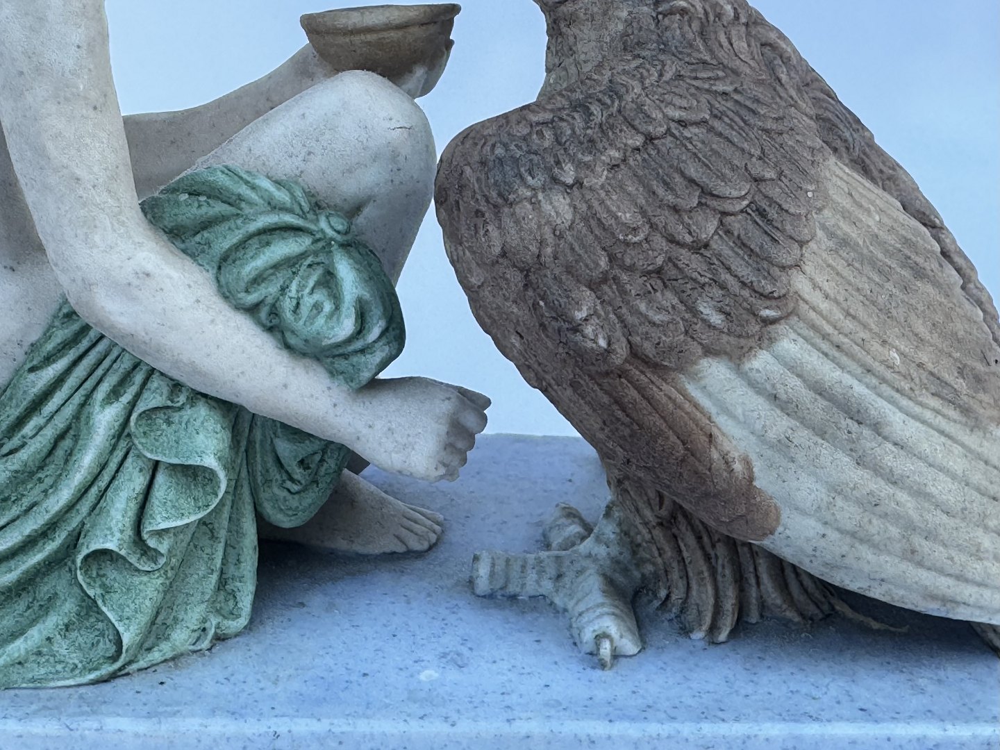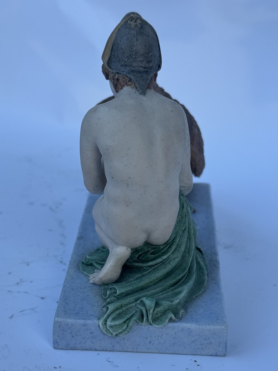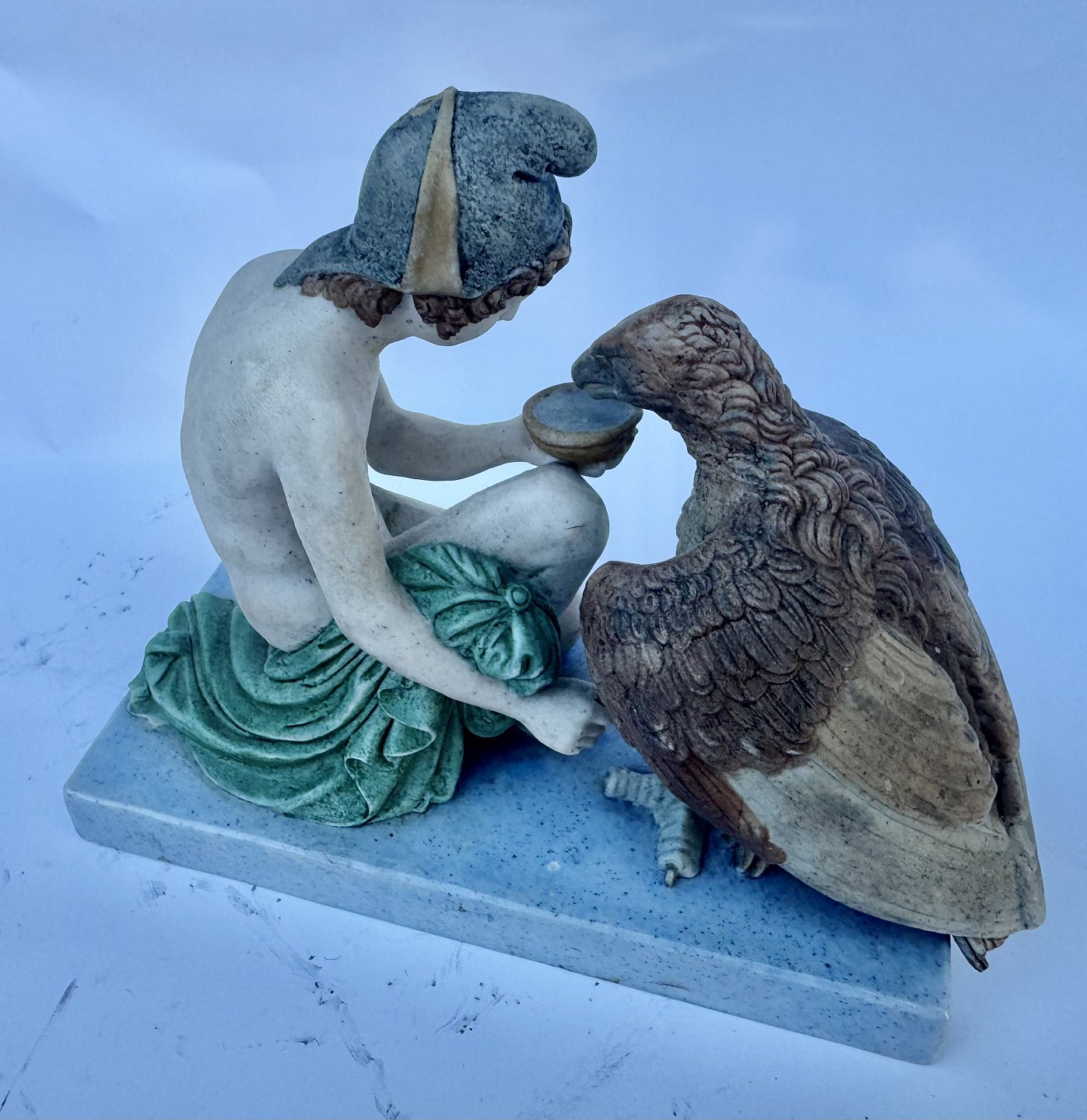 Figure in painted bisque porcelain depicting Ganymede with Jupiter's (Zeus' according to Greek mythology) eagle by Bertel Thorvaldsen (1770-1844) Designed in Rome 1817-18. This reproduction was produced by Royal Copenhagen in the late 19th century. According to Greek mythology, Zeus' (Jupiter's) eagle abducts Ganymede in order to make him the cupbearer (servant) of the gods. Factory mark on the bottom with the factory's well-known three blue waves. The figure is missing Ganymede's jug in his right hand, and there is a small chip on the eagle's tail. Dimensions: H. 11 cm. The base measures 6 x 12.5 cm.This painted version may have been exhibited, together with other of Thorvaldsen's white Bisquit figures, at the great World Exhibition in Paris in 1900.