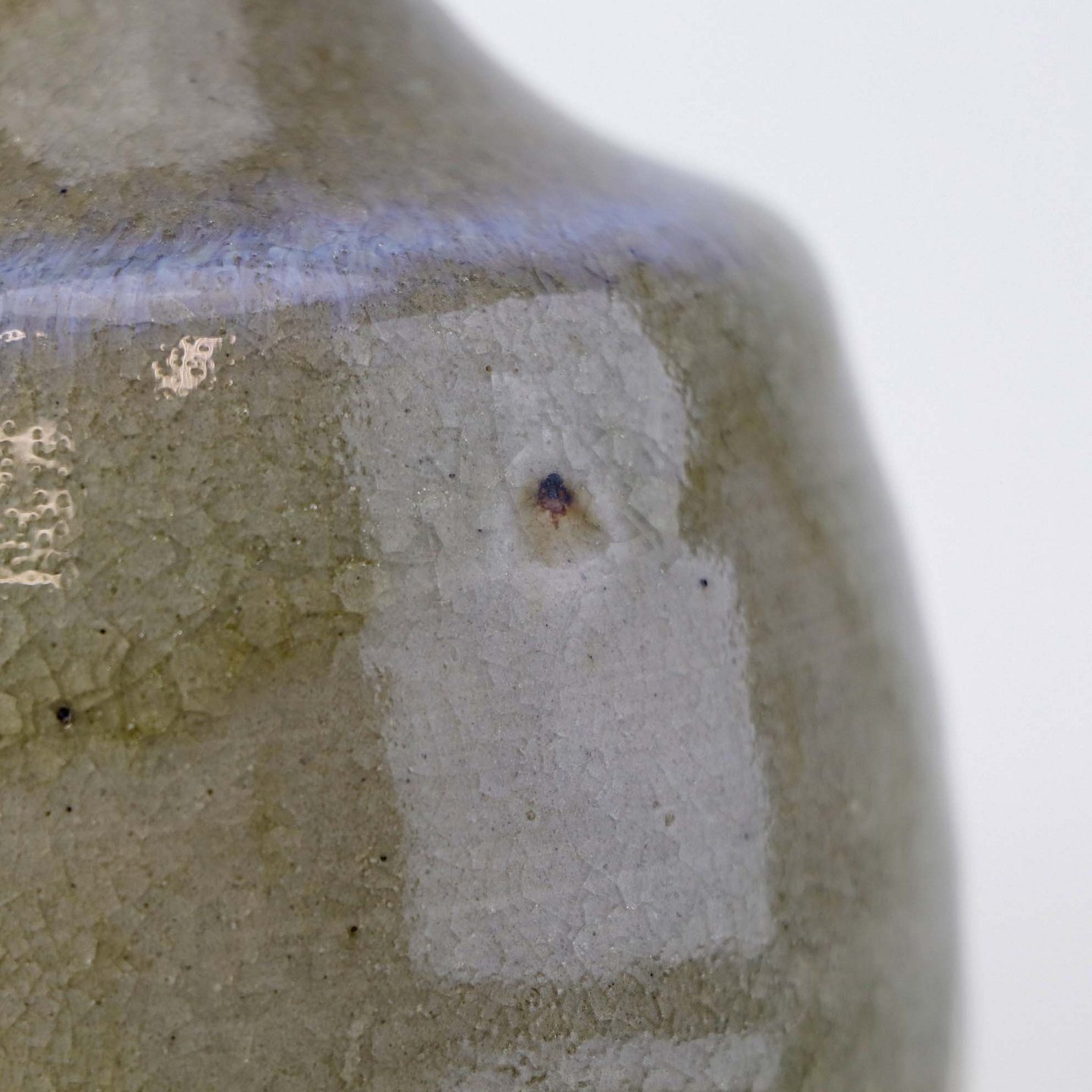 Vase i stentøj med beigefarvet glasur med mørke nister og krakkeleringer samt med en fremhævet blå kant.Producent Finn Lynggaard
