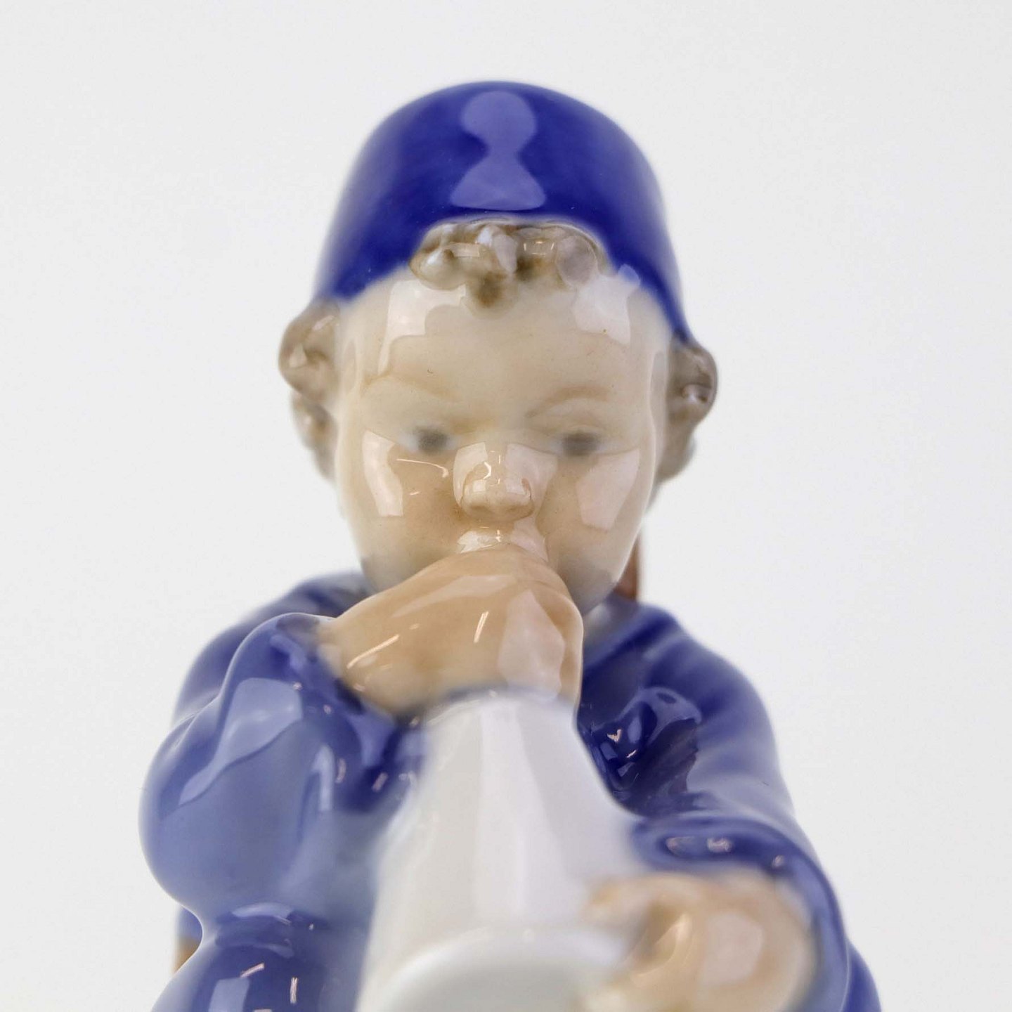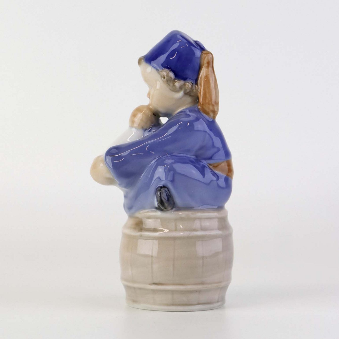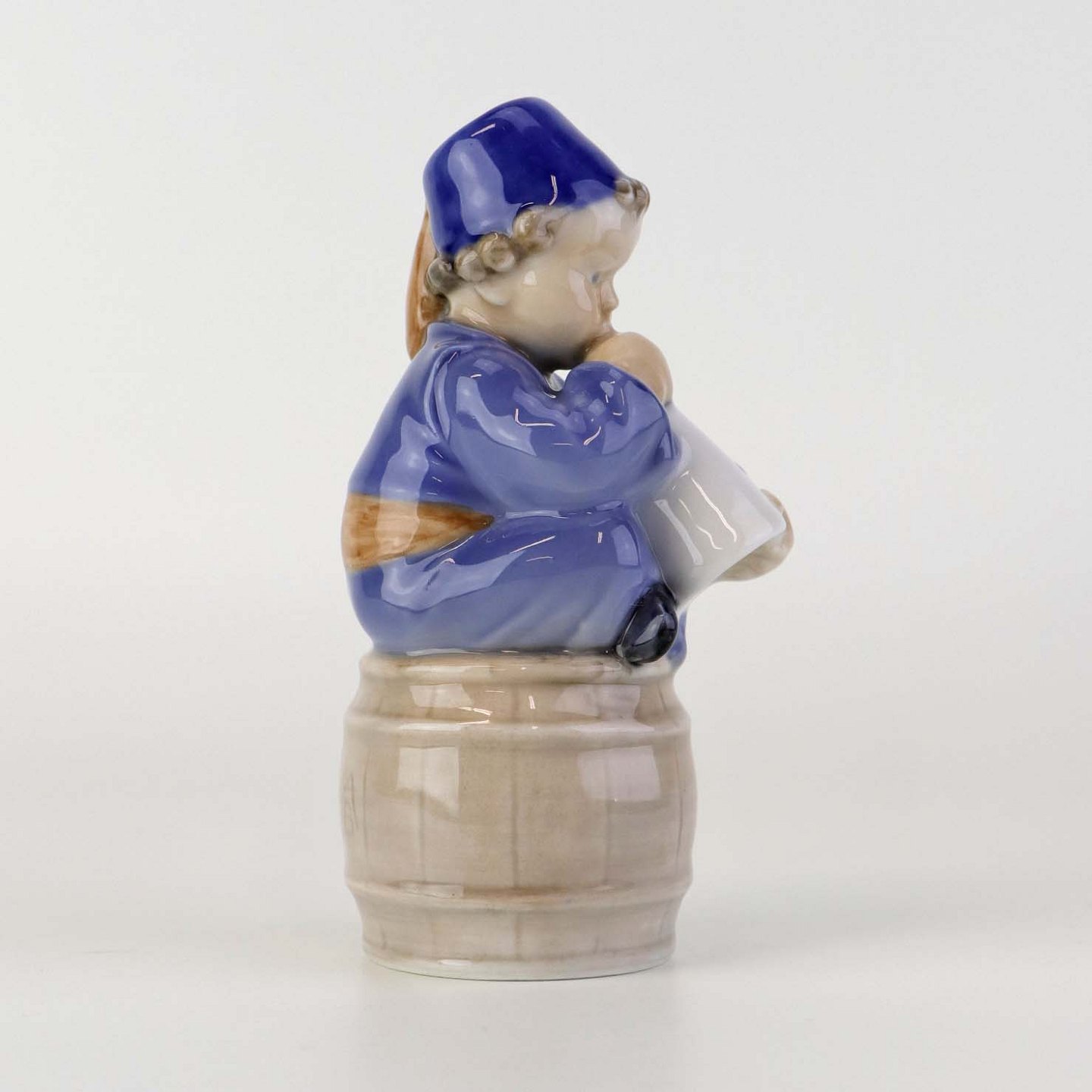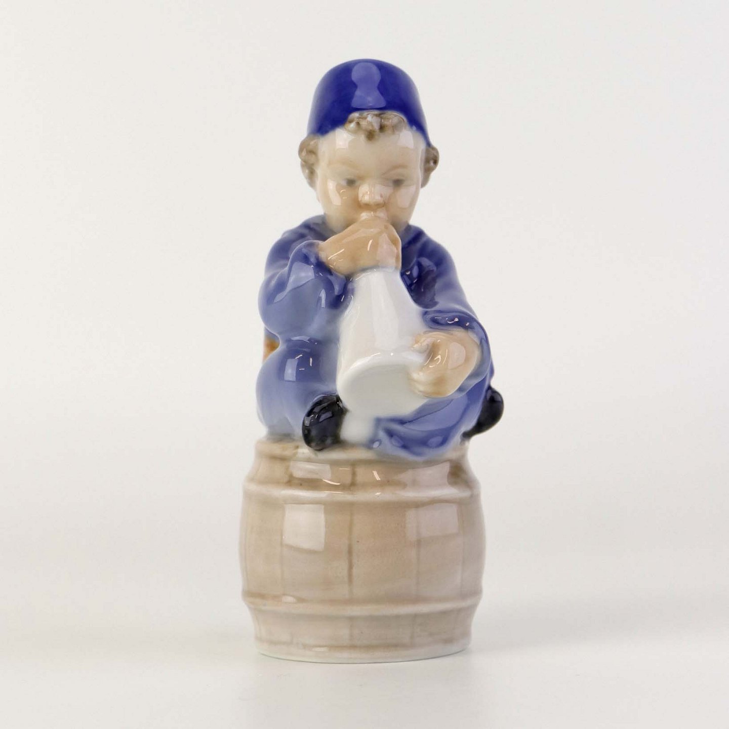 Figur i porcelæn med motiv af siddende dreng på tønde blæsende på et horn. Nr. 3689Formgiver Ada Bonfils