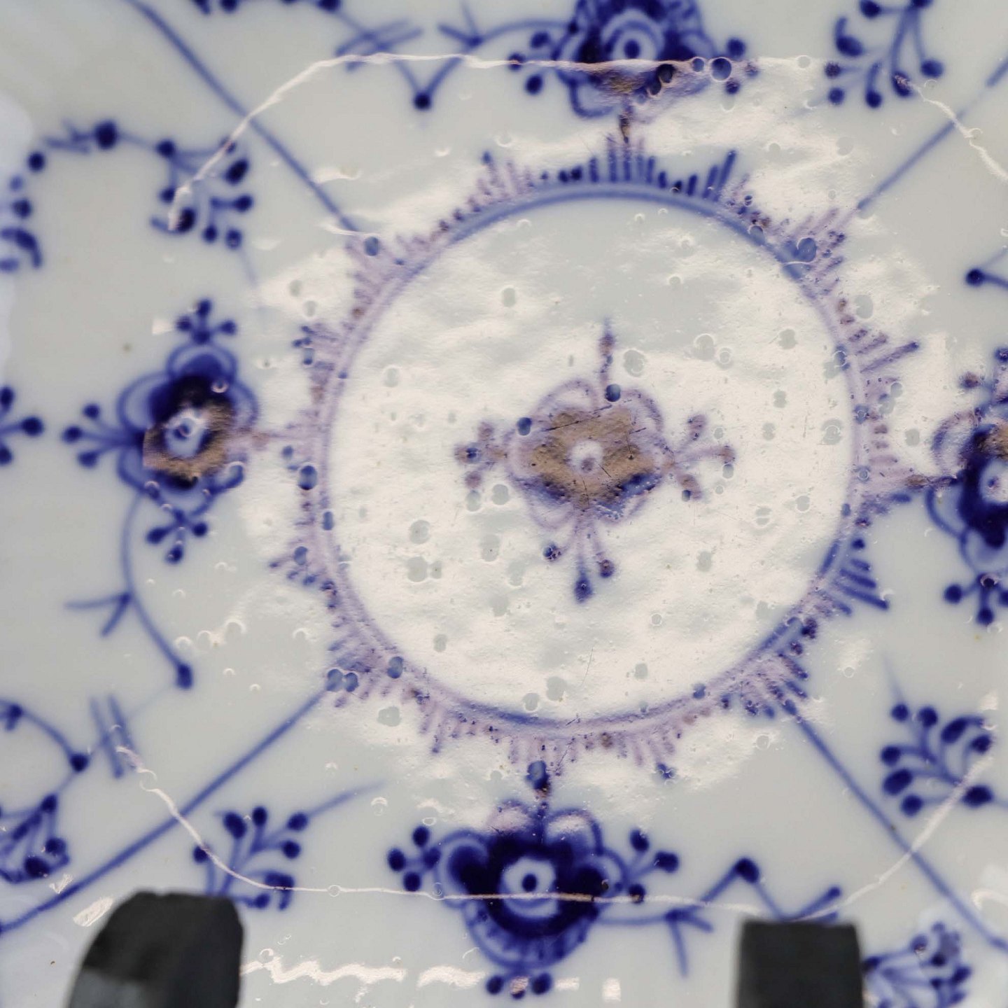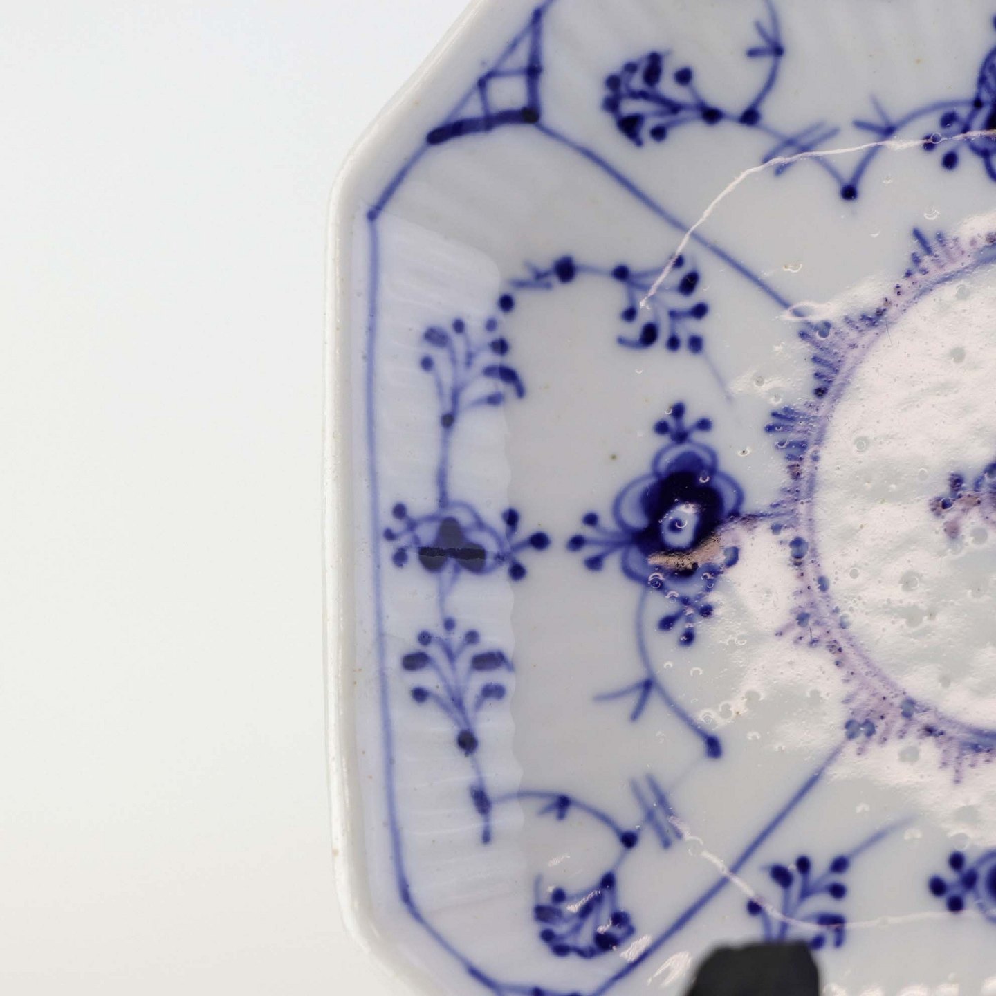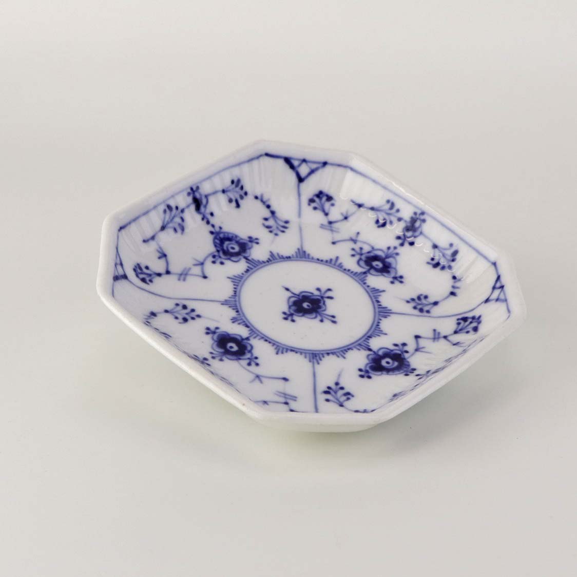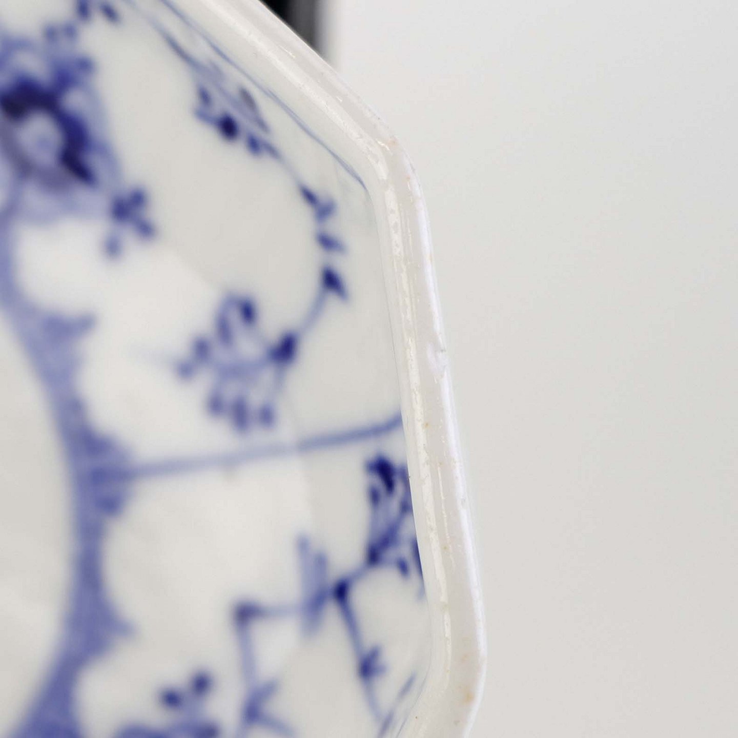 Musselmalet er af kongeligt hvidt porcelæn, dekoreret med rifler og mønster af blå ranker og blomster.
