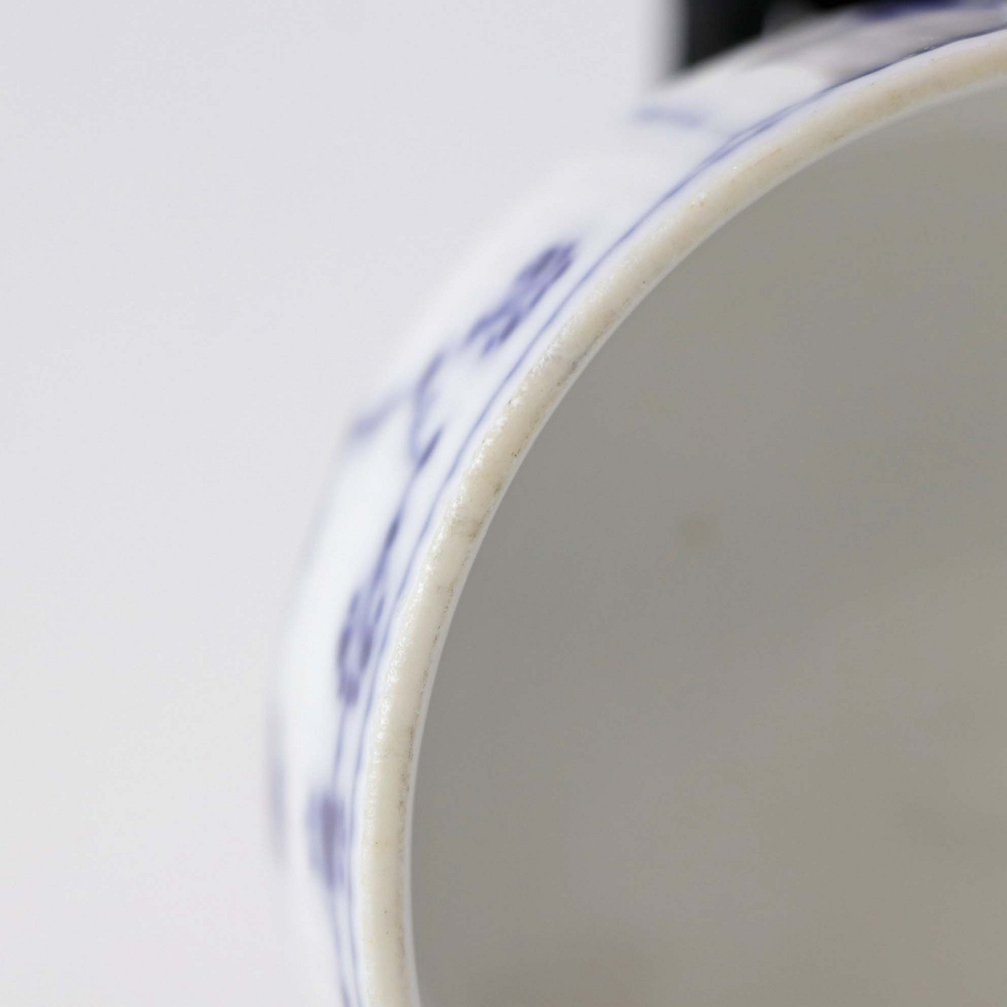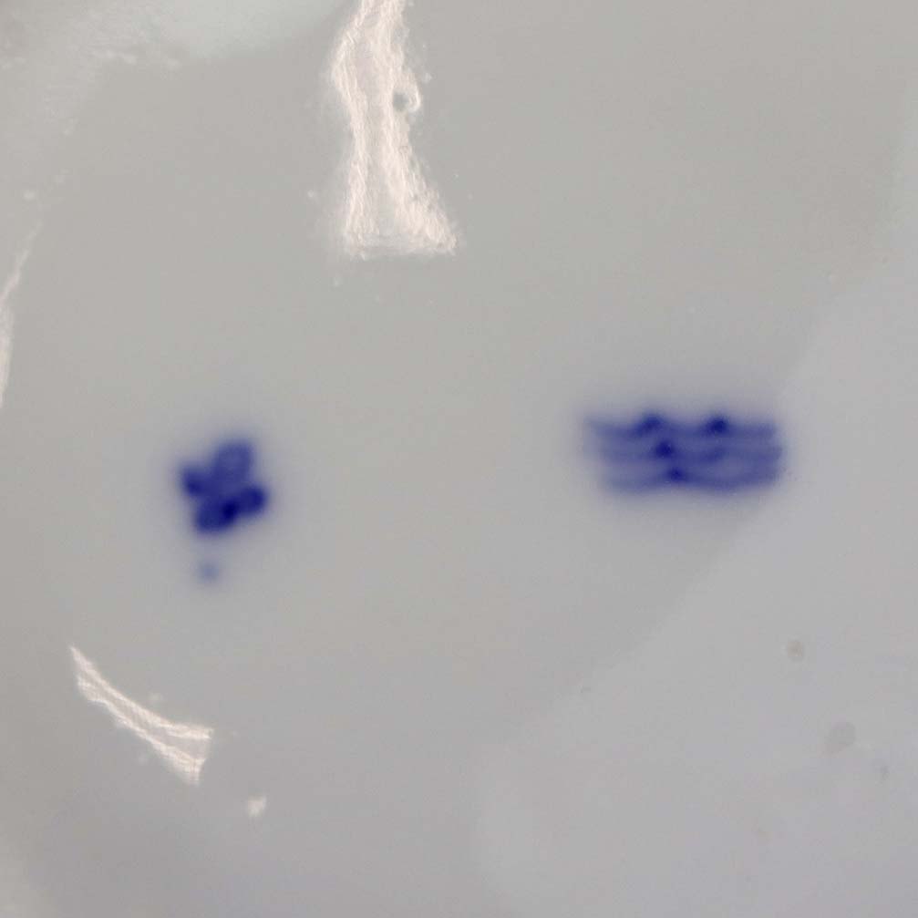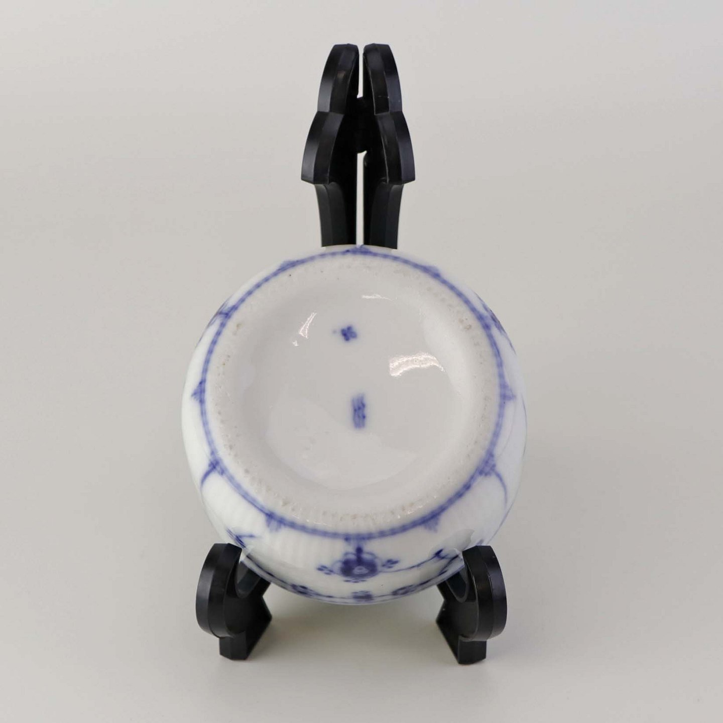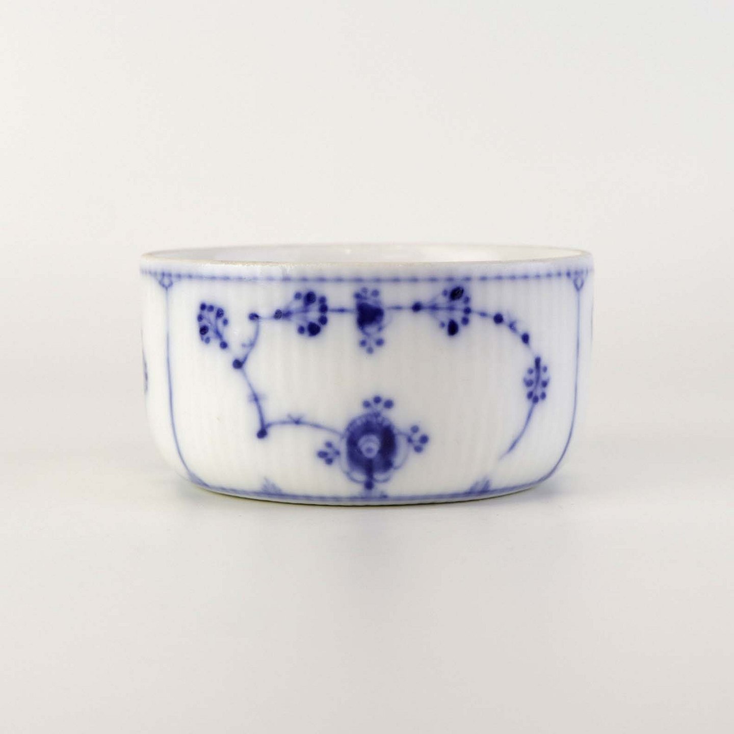 Musselmalet er af kongeligt hvidt porcelæn, dekoreret med rifler og mønster af blå ranker og blomster.