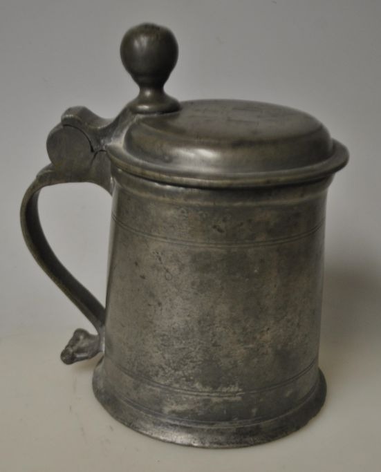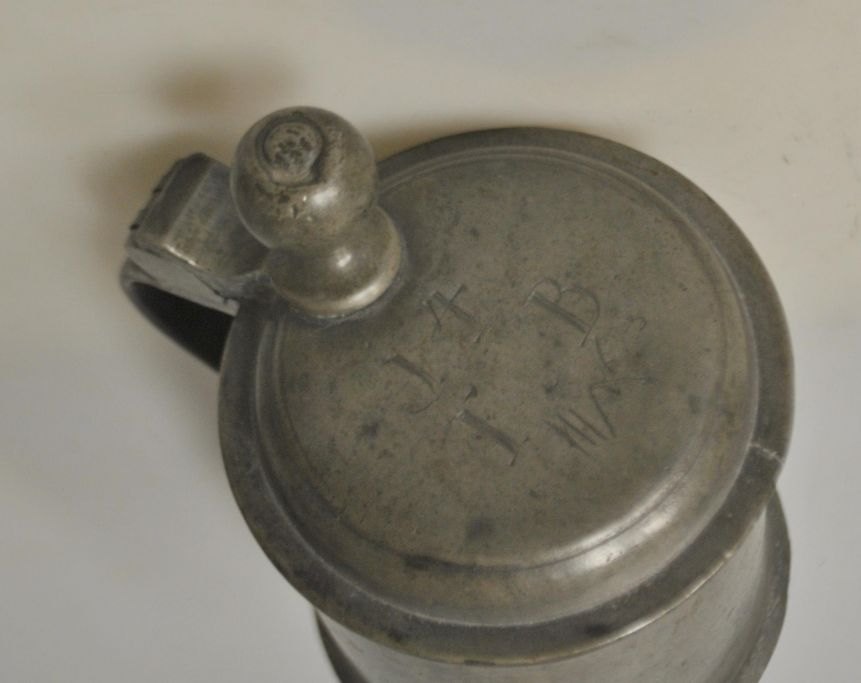 Pewter mug 1763, Germany. Conical with handle and spout. Stamped in lid. H.: 16 cm. Engravings on lid.Item number: 28723
