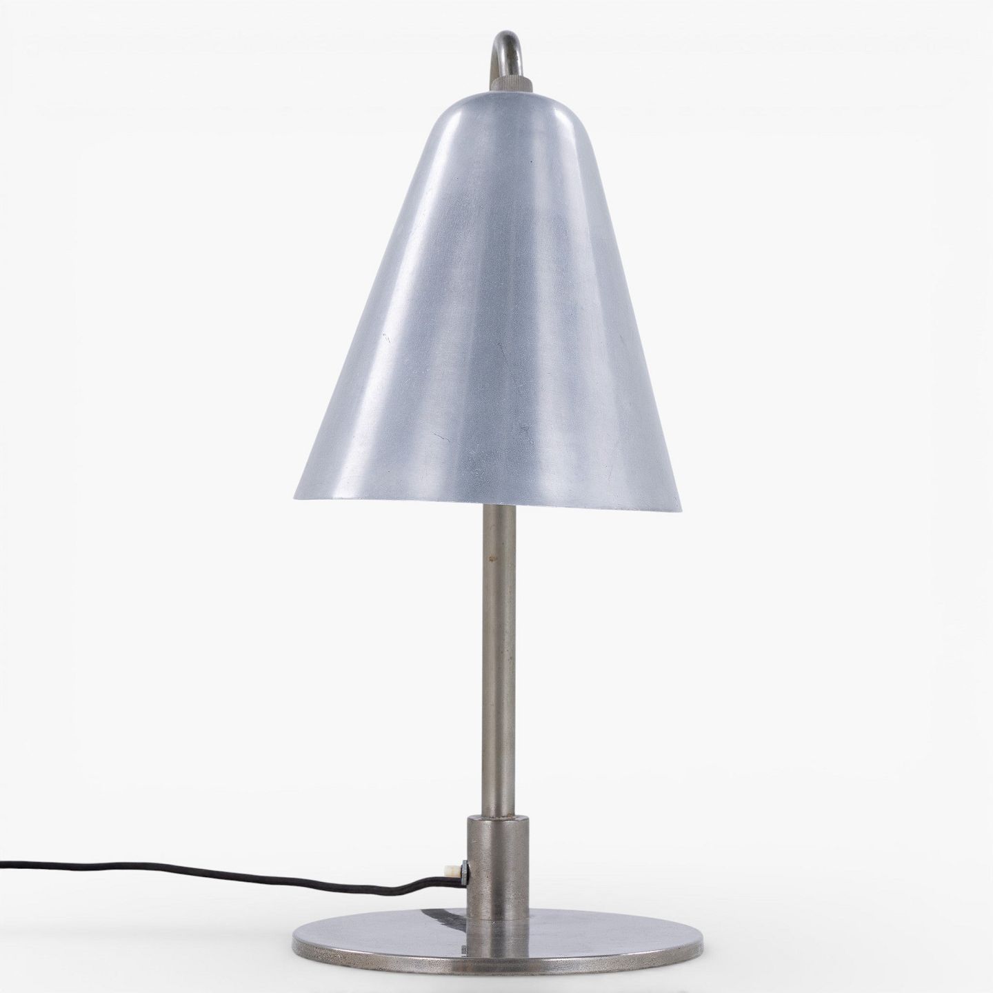 Rare table lamp in nickel-plated metal with funnel-shaped shade. Made in the 1930s.