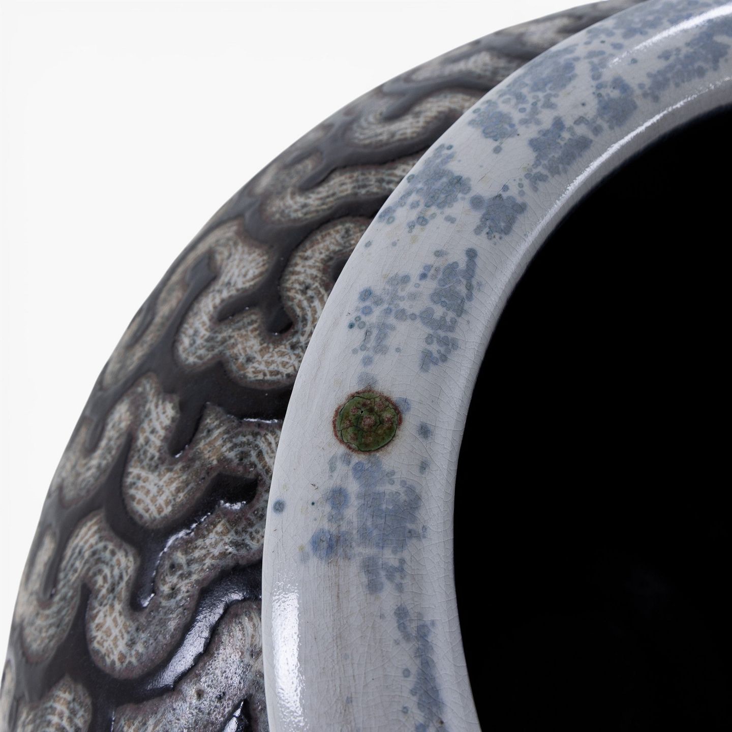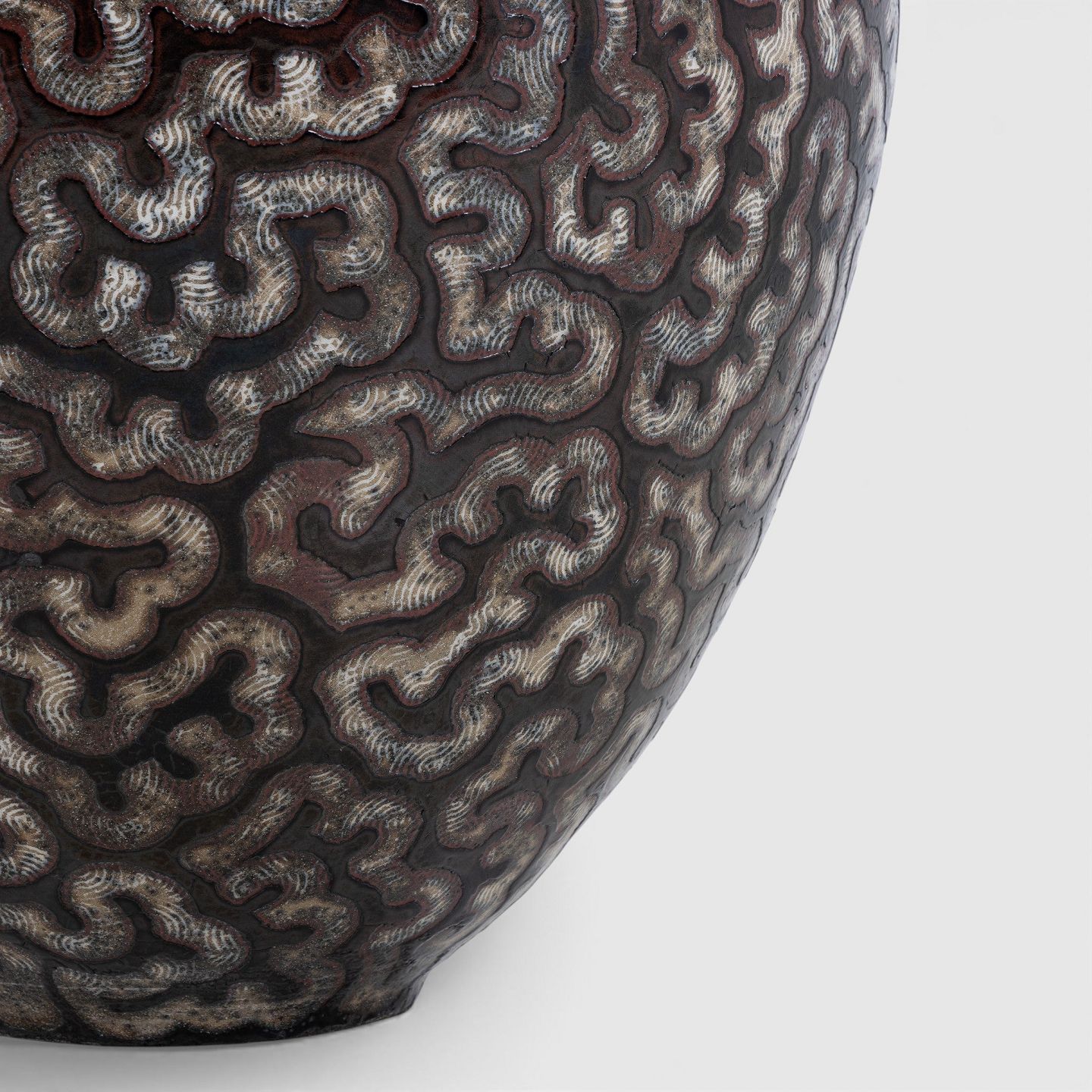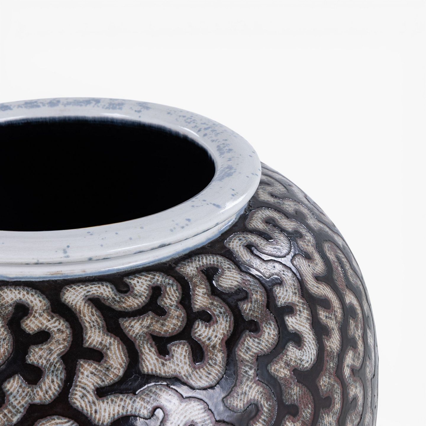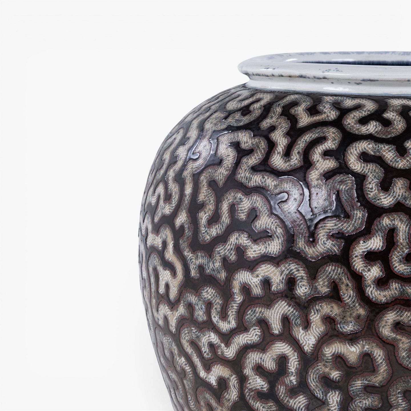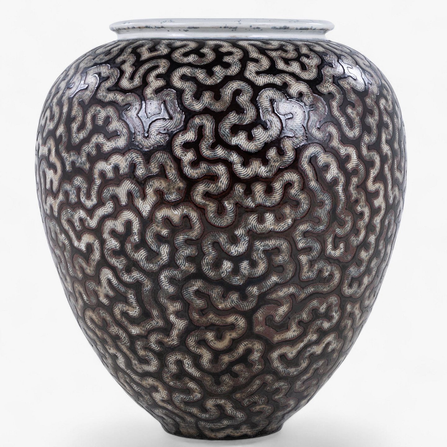 Colossal stoneware jar with black glaze and white decorations. Signed.