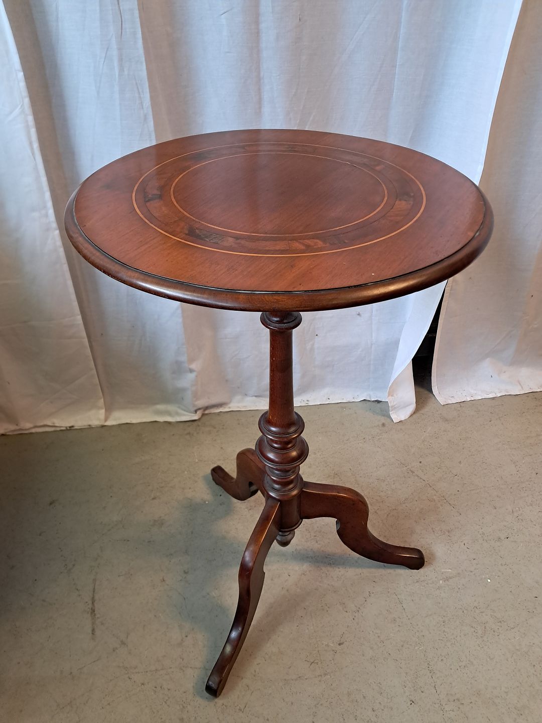 Rundt bord i fineret mahogni, fra 1910erne.Det har brugsspor.