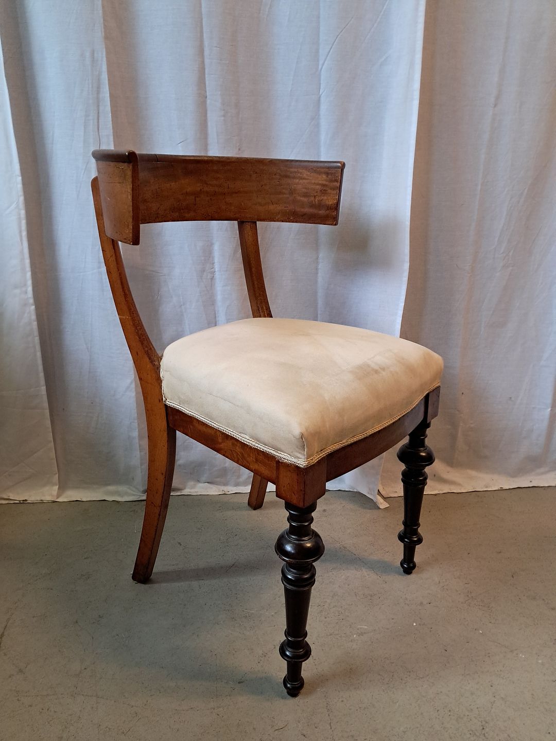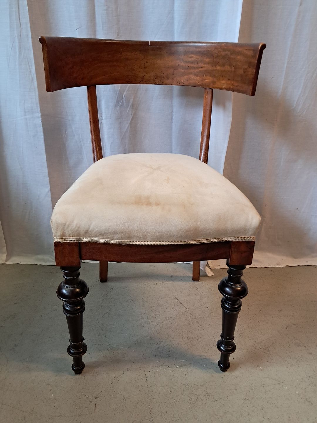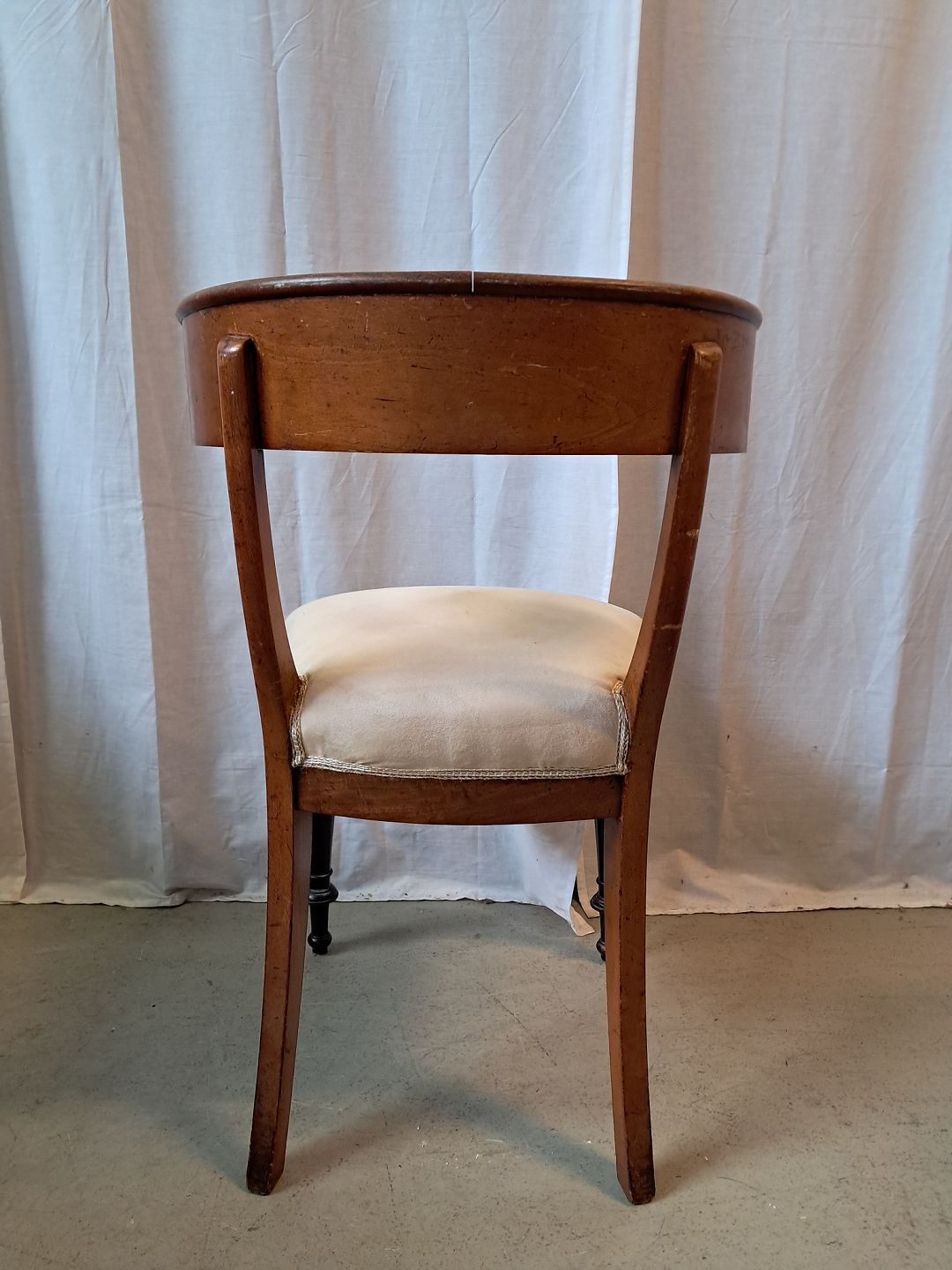 Stol i bøgetræ og fineret nødetræ, fra 1900erne.Den har brugsspor.