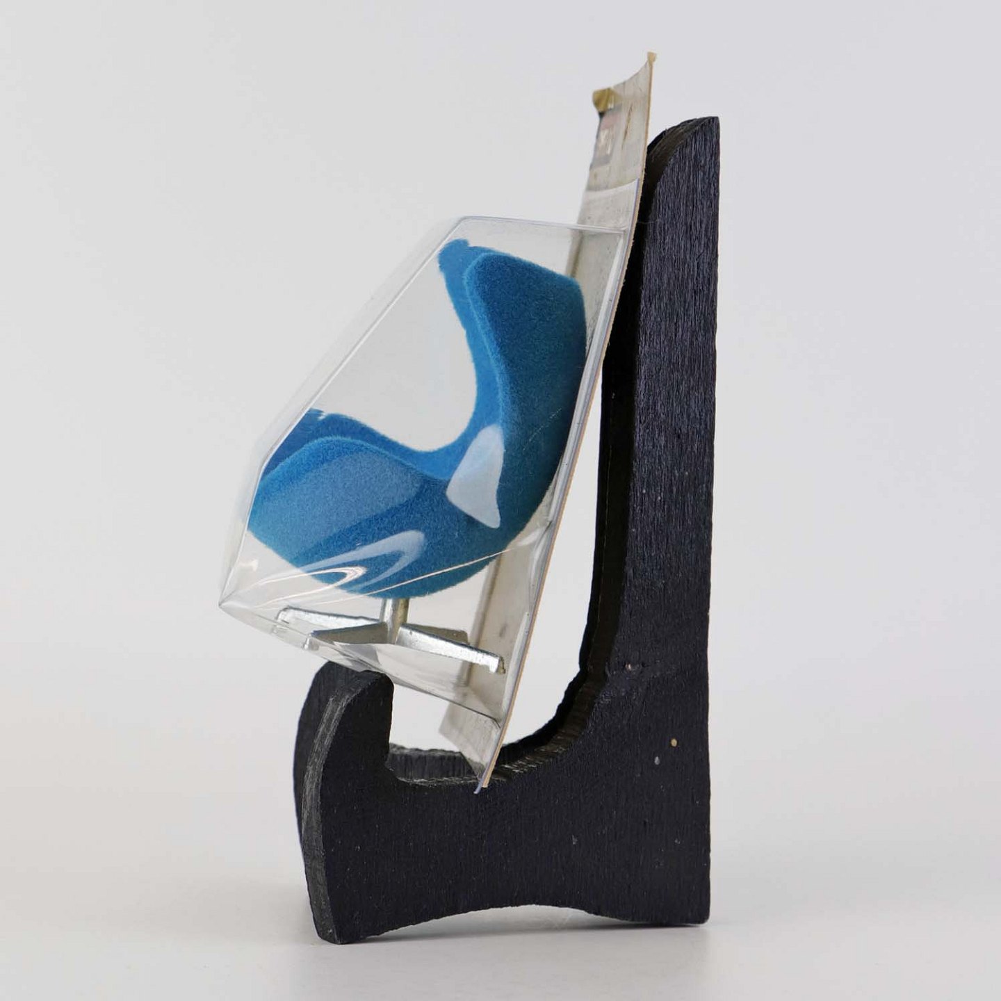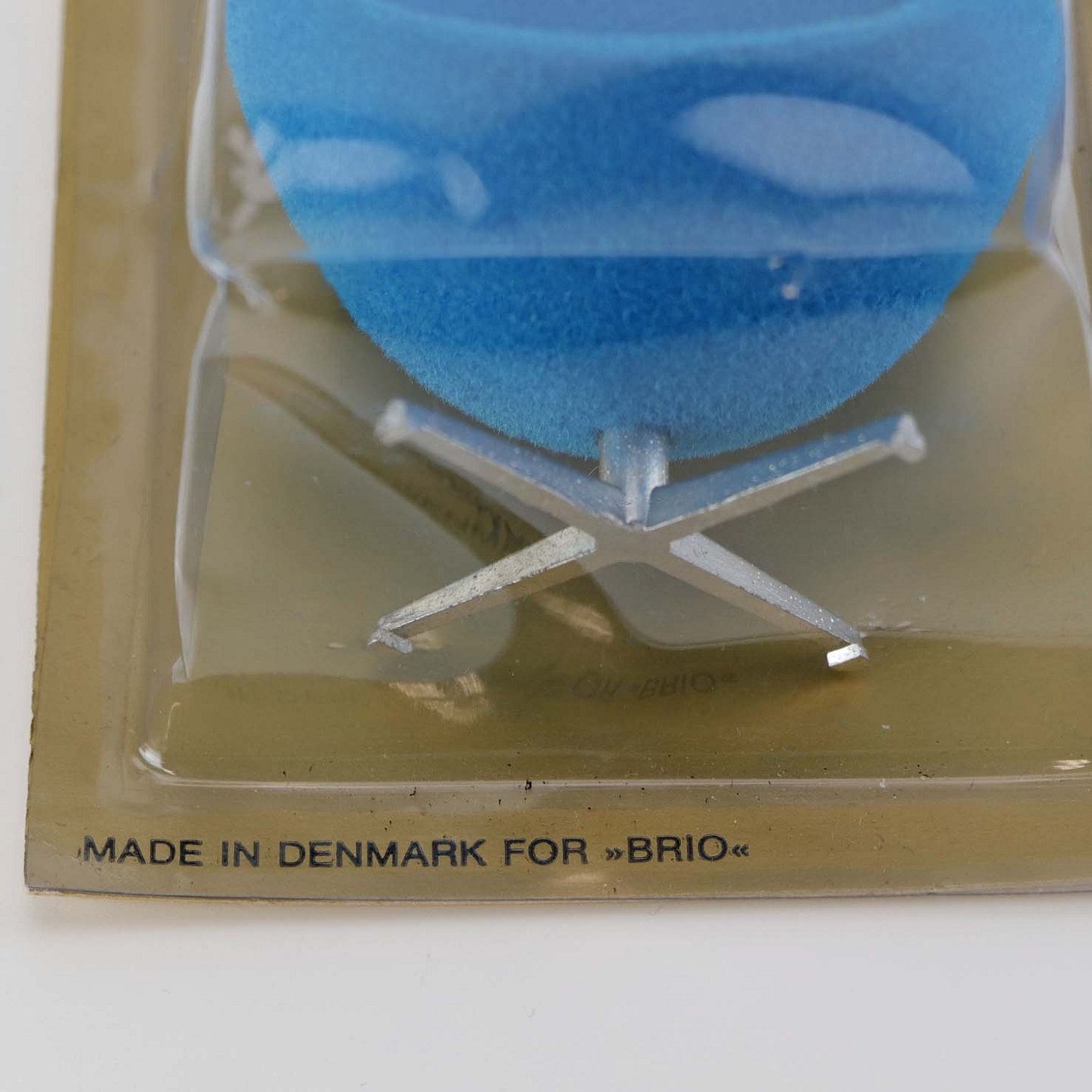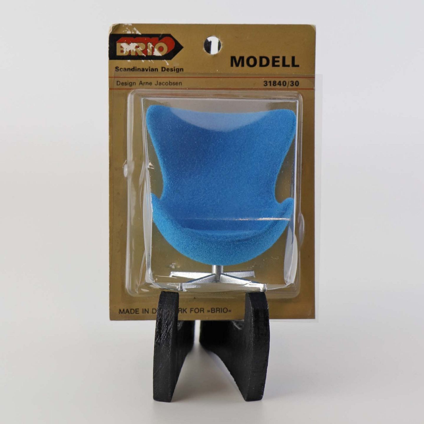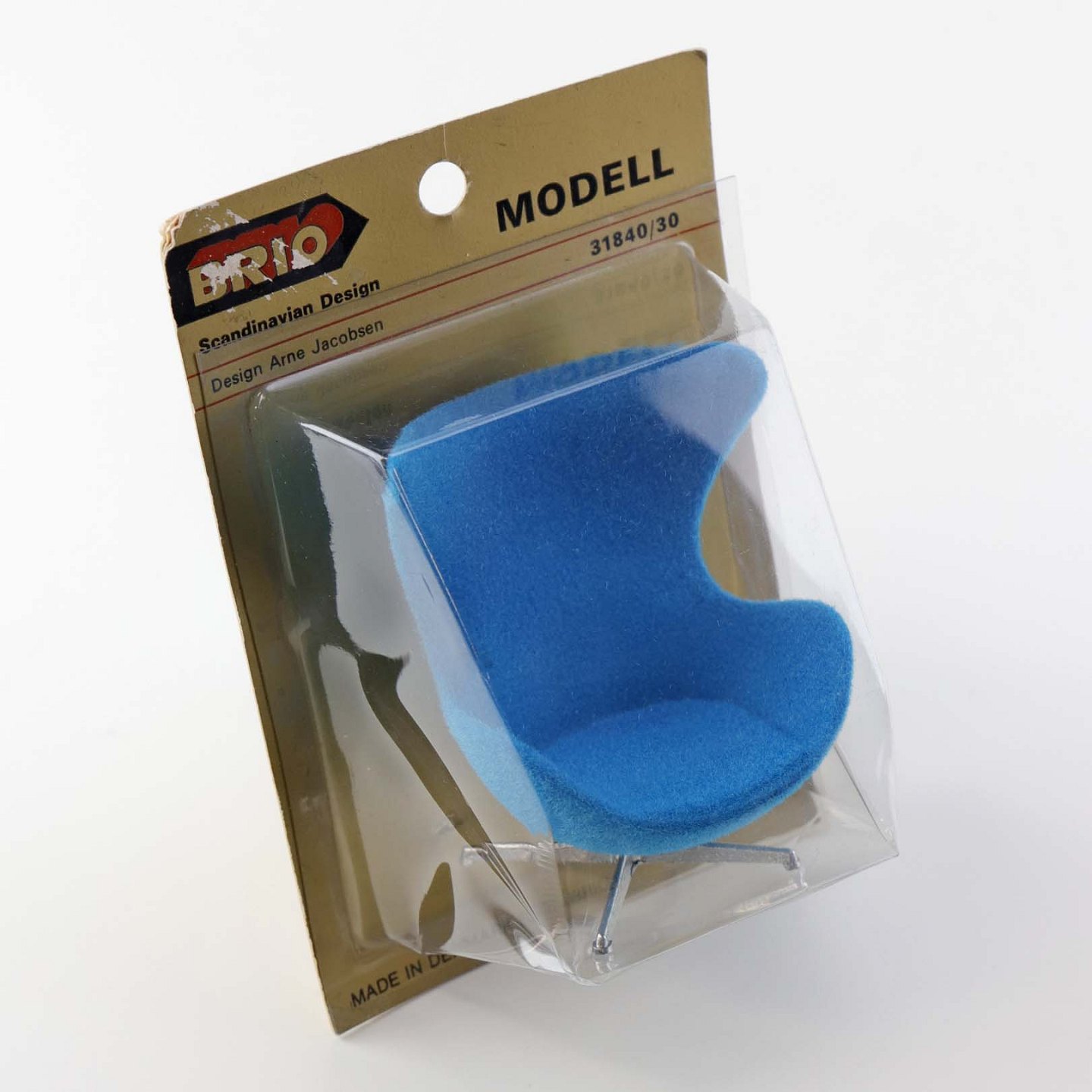 Blå miniature stol til dukkehus med model af Arne Jacobsen's lænestol Ægget. Model 31840/30Design Arne Jacobsen