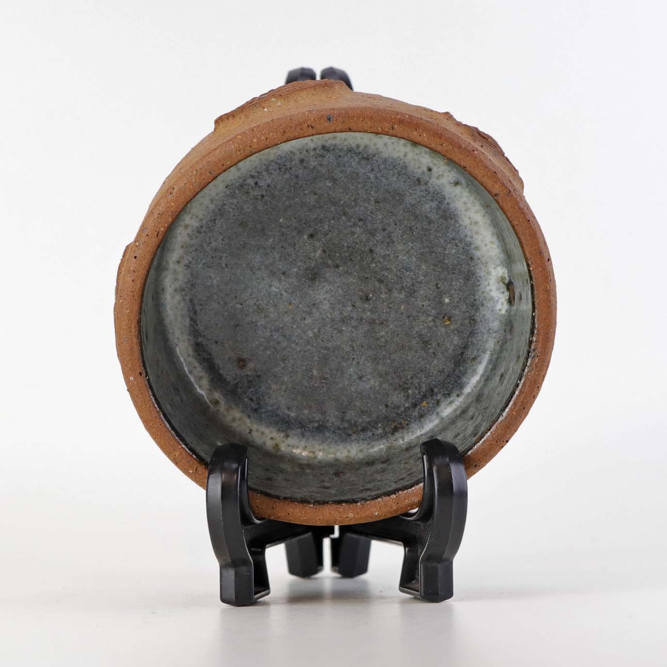 Lille rund skål i keramik med grå glasur på indersiden samt abstrakt mønstret yderside i uglaseret keramik.Formgiver Conny Walther