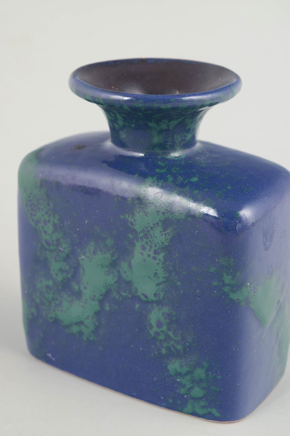 Compact sculptural vase in stoneware with a rich, glossy glaze in deep blue and green tones. The form is simple and well-balanced, with softly rounded sides and a narrow neck.