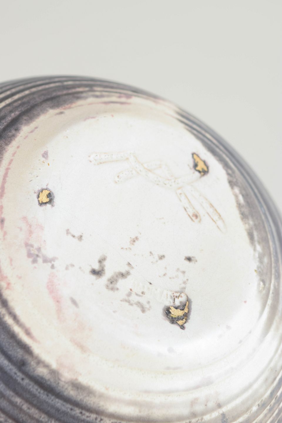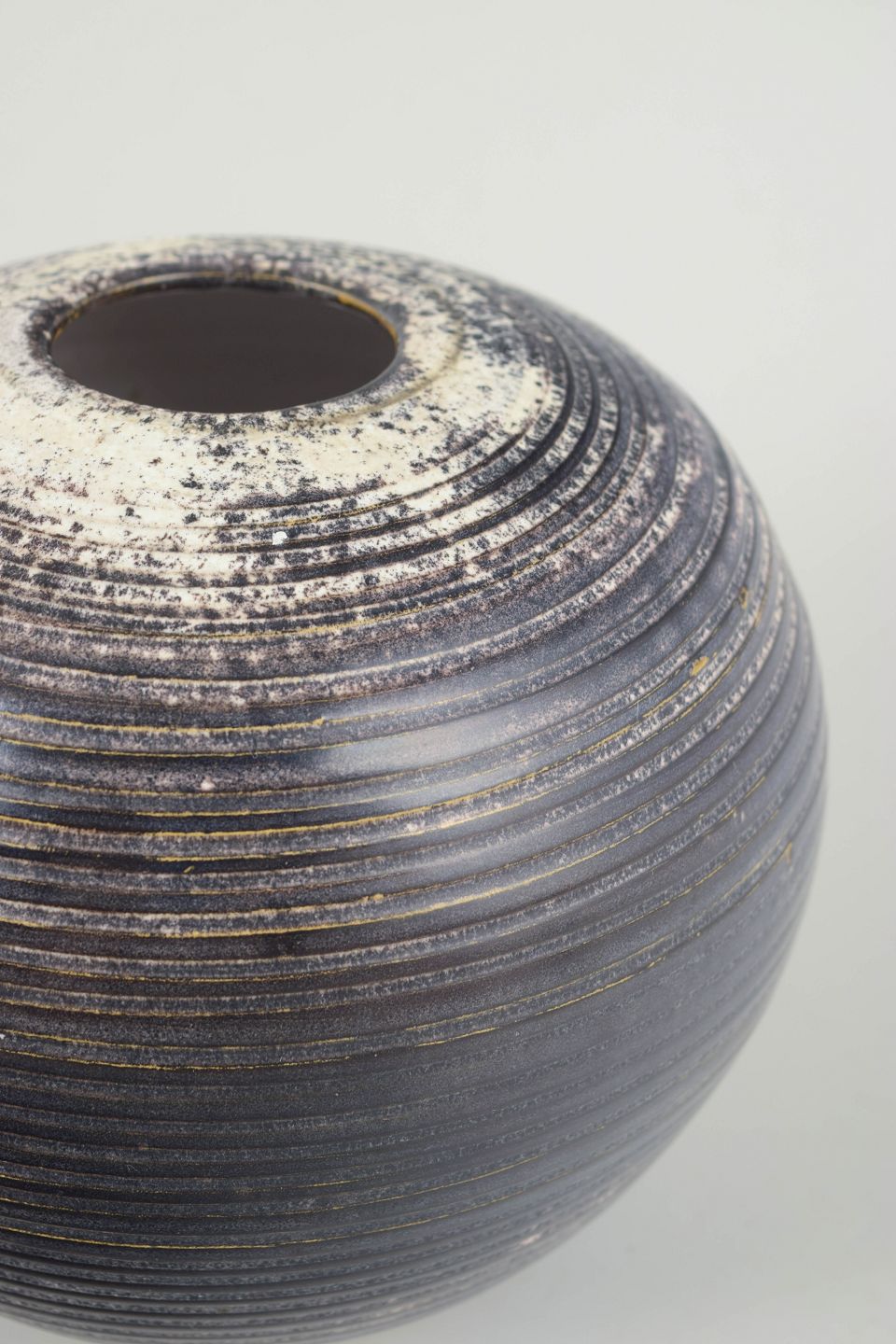 Svend Hammershøi for Kähler vase, 1930s.Spherical thrown stoneware vase with a characteristic ribbed surface and a double glaze in black and grey tones, creating a subtle depth and nuanced surface play.